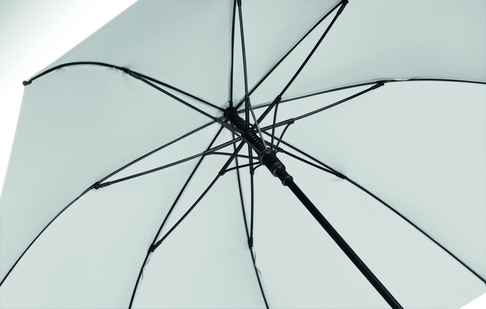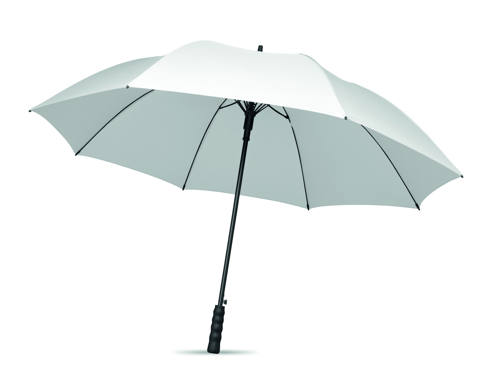 27 inch auto open umbrella in 190T pongee with black plated metal shaft and ribs. Black plastic tips. Straight black EVA handle. Manual closure.