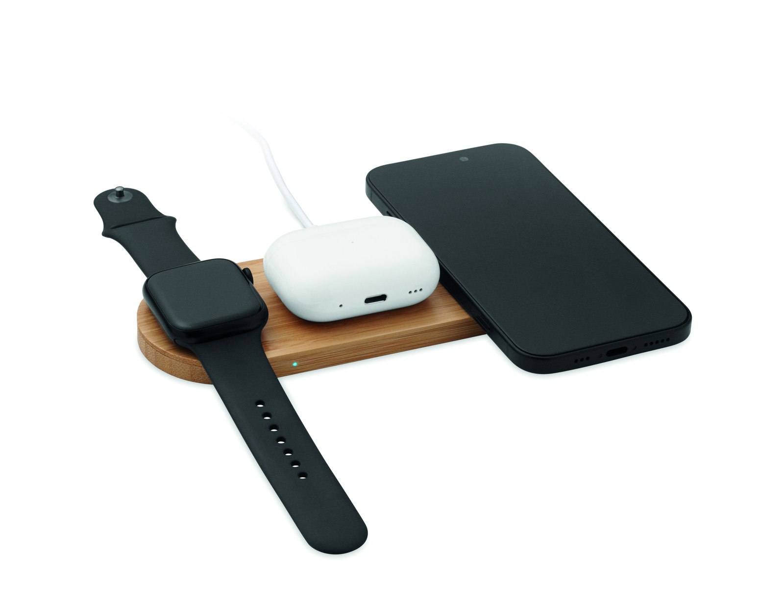 3 in 1 charging station in bamboo case. It includes a wireless charger 15W, smartwatch charger (Apple® only) and TWS charger.