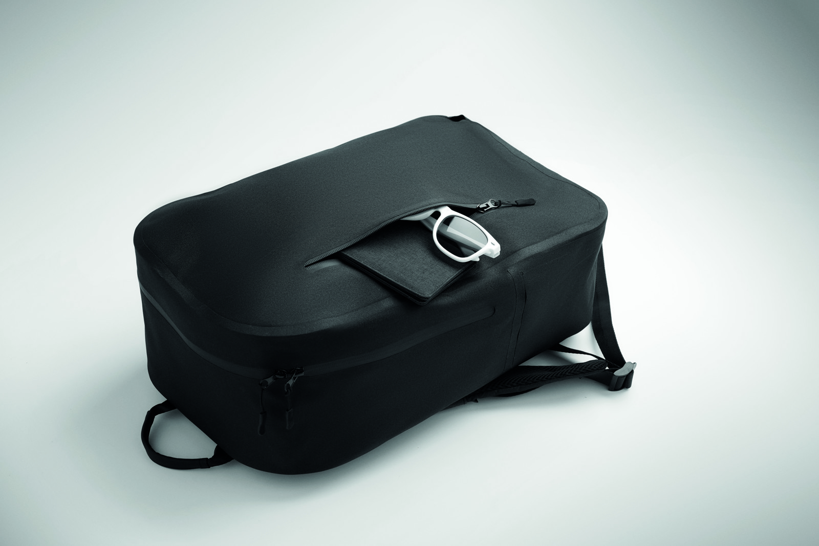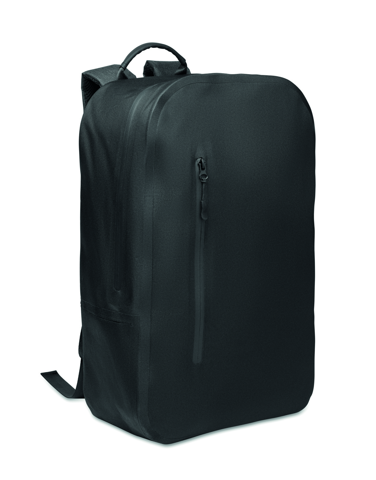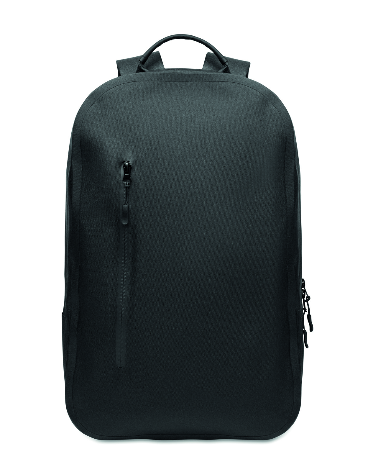 Laptop backpack 16'' in 300D RPET polyester and 210D polyester lining. Water-resistant fabric. Hidden zippered pocket and trolley holder on the back. Padded internal laptop compartment, mesh back and shoulder strap.