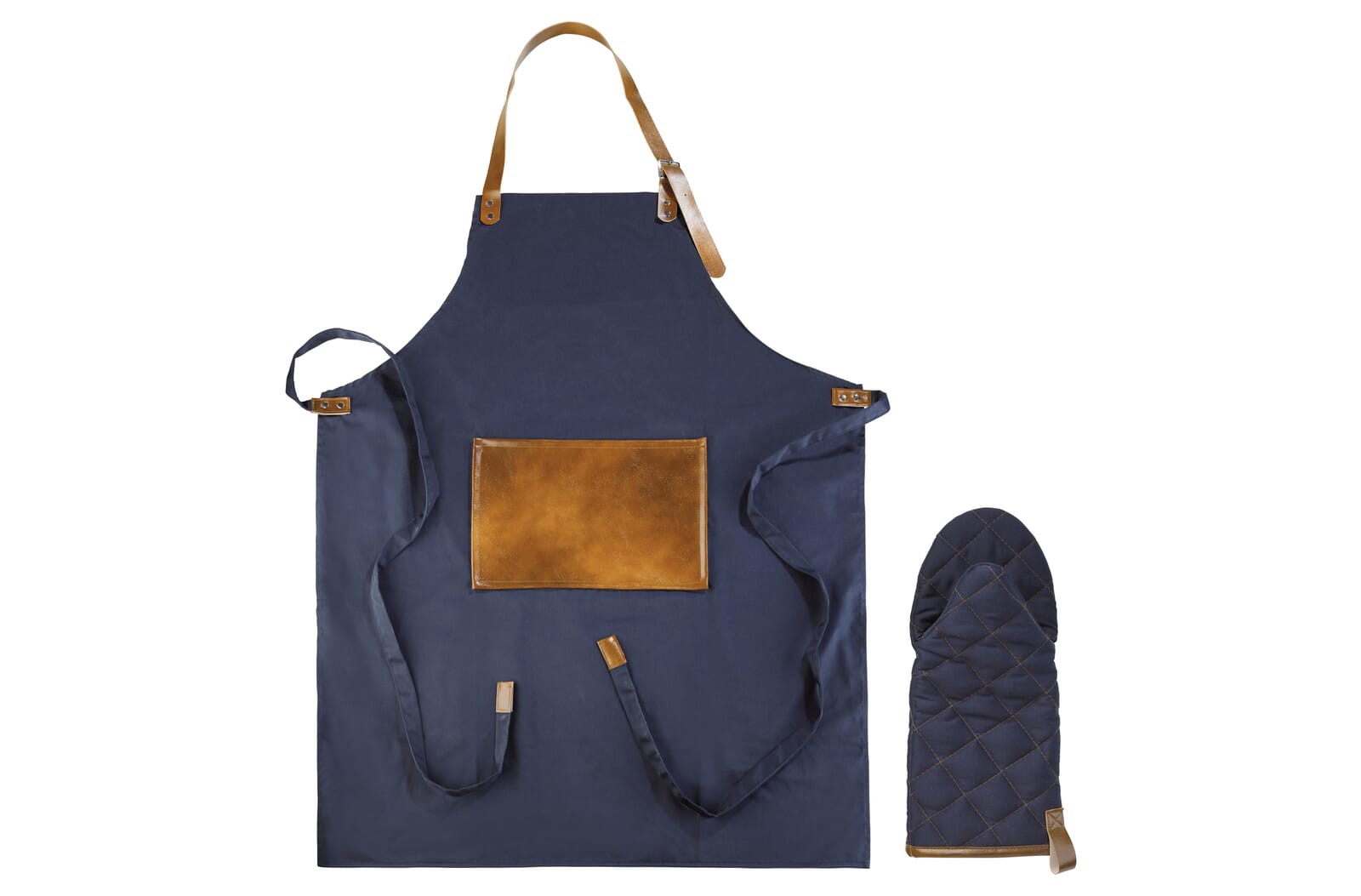 Trendy apron in heavy quality material with a PU front pocket and a matching mitt. A perfect item for the grill masters among us. Comes packaged in a gift box.