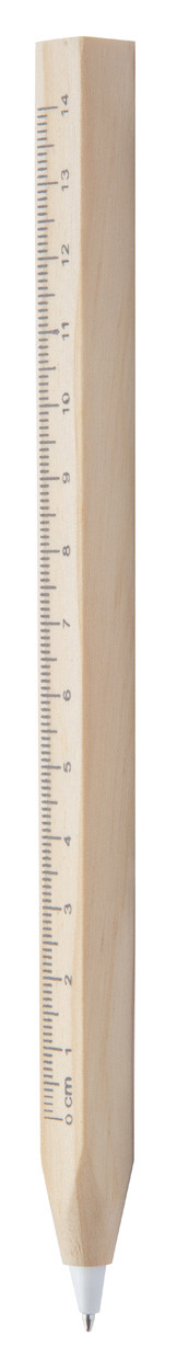 Wooden ballpoint pen with square barrel and 14 cm ruler on one side. With blue refill.