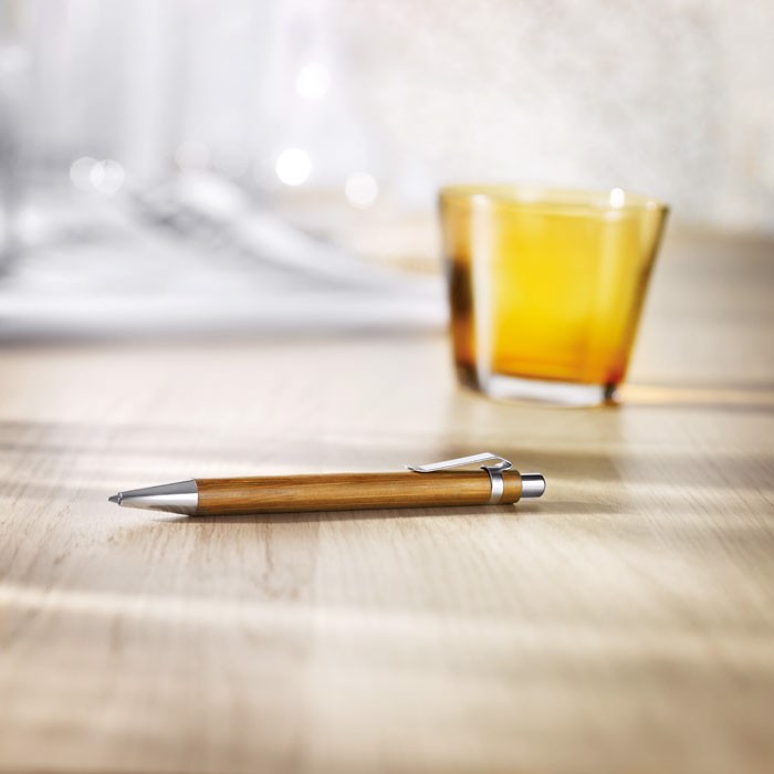 Push button ball pen in bamboo with shiny chrome fitting. Blue ink. Bamboo is a natural product, there may be slight variations in colour and size per item, which can affect the final decoration outcome. FSC®-certified | FSC 100%, N5.7, FSC-C213206