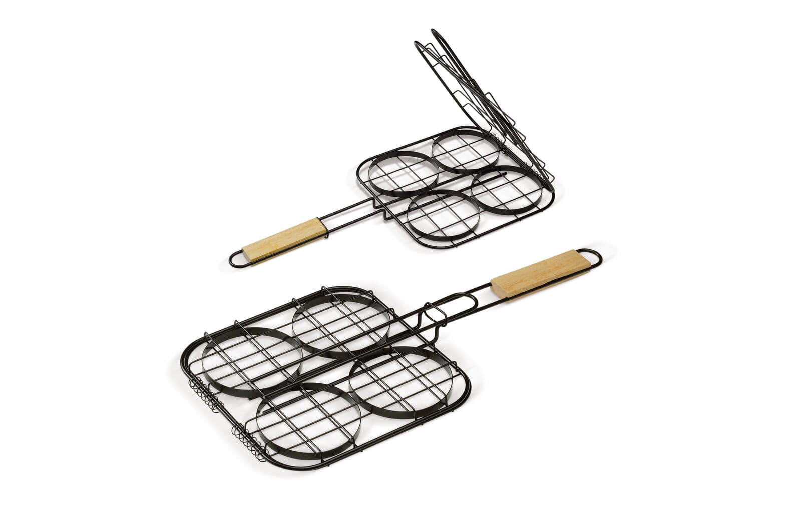 Hamburger grill to grill four hamburger patties at a time. The patties can easily be turned. The large wooden handle will prevent your hands from burning.