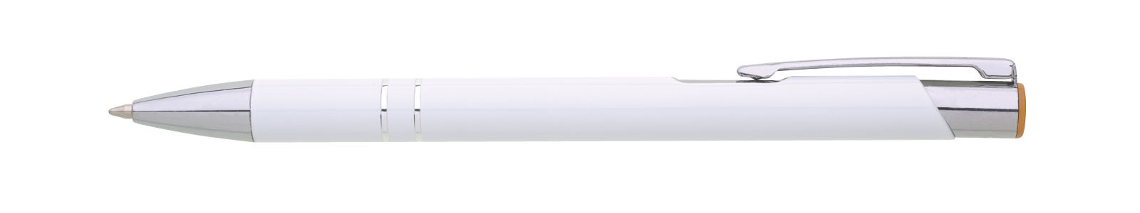Metal aluminium pen CITTA with a white surface. The body of the pen is decorated with two silver stripes and colored laser engraving in the same colour as the upper end of the pen. Large-capacity refill, blue ink.