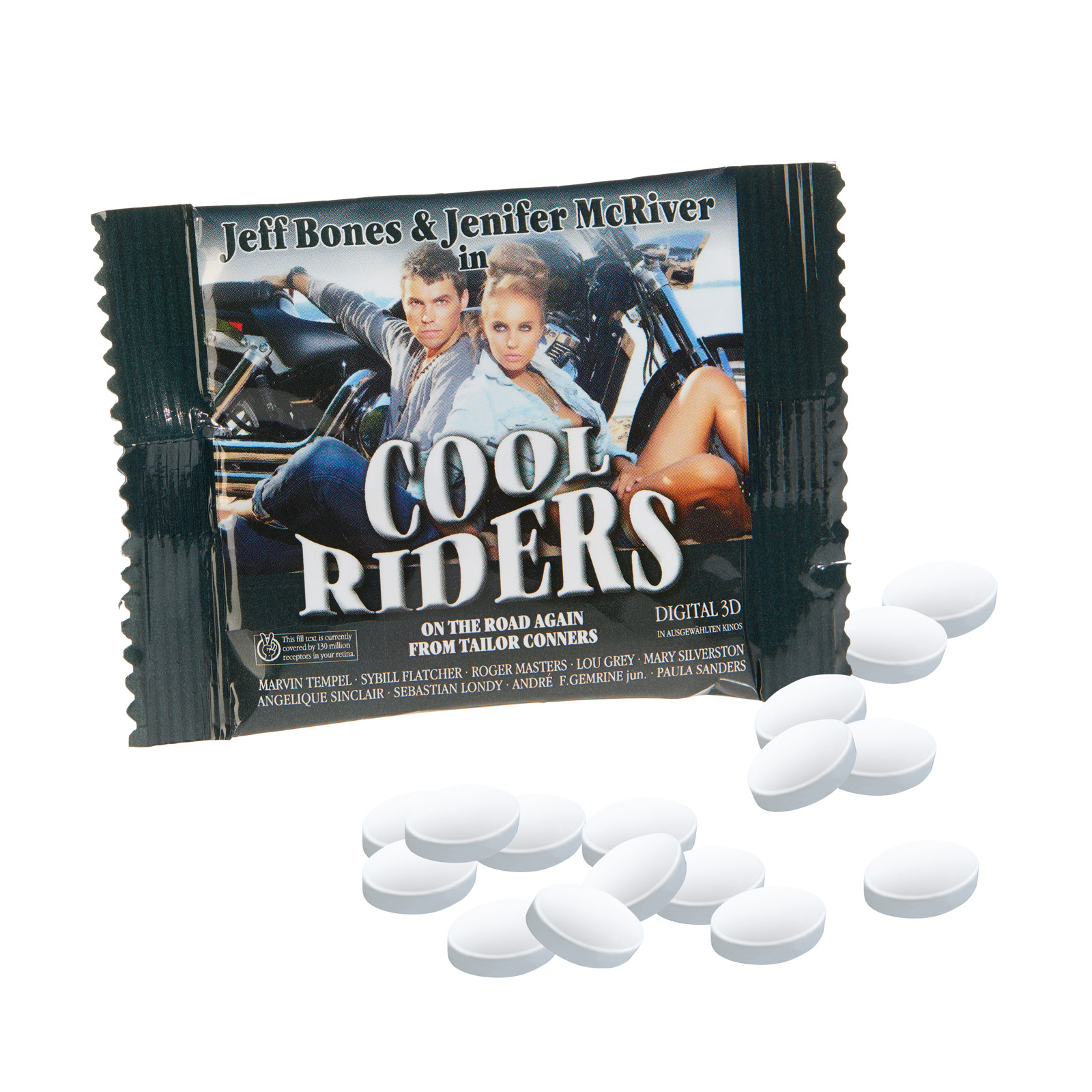 Velvety rounded and sugar-free pastilles (approx. 1.6 kcal/pastille), oval 13 x 10 mm, with ice flavour, packed in a shiny or matt coated white or transparent bag – refreshing with every breath.
