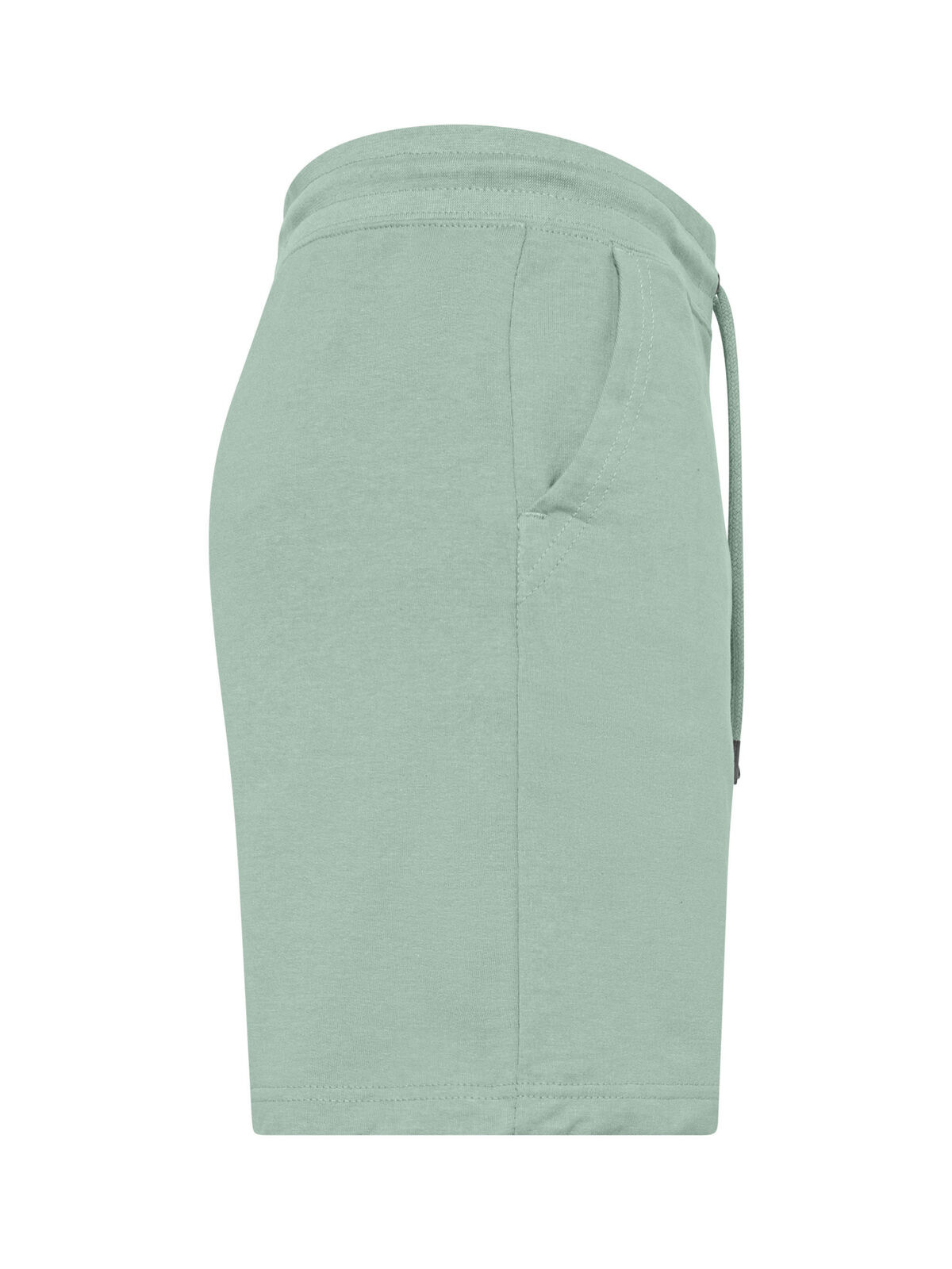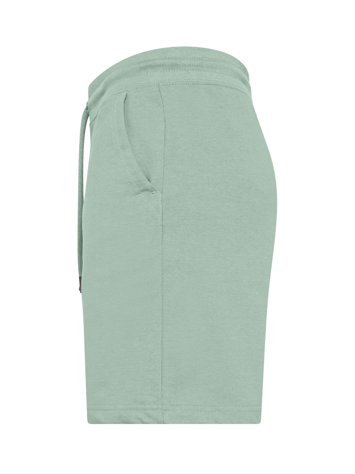 80% cotton, 20% polyester. French Terry shorts, single jersey on inside waistband and inside pockets, self fabric waistband, dyed to match round drawcord with metal tipped ends, metal eyelets, bottom hem with narrow single jersey binding continuing to waistband at side seams, flatlock topstitch on waistband and pocket opening. Tear-Away Label. Outer fabric: 100% cotton; inner fabric: 50% cotton, 50% polyester.