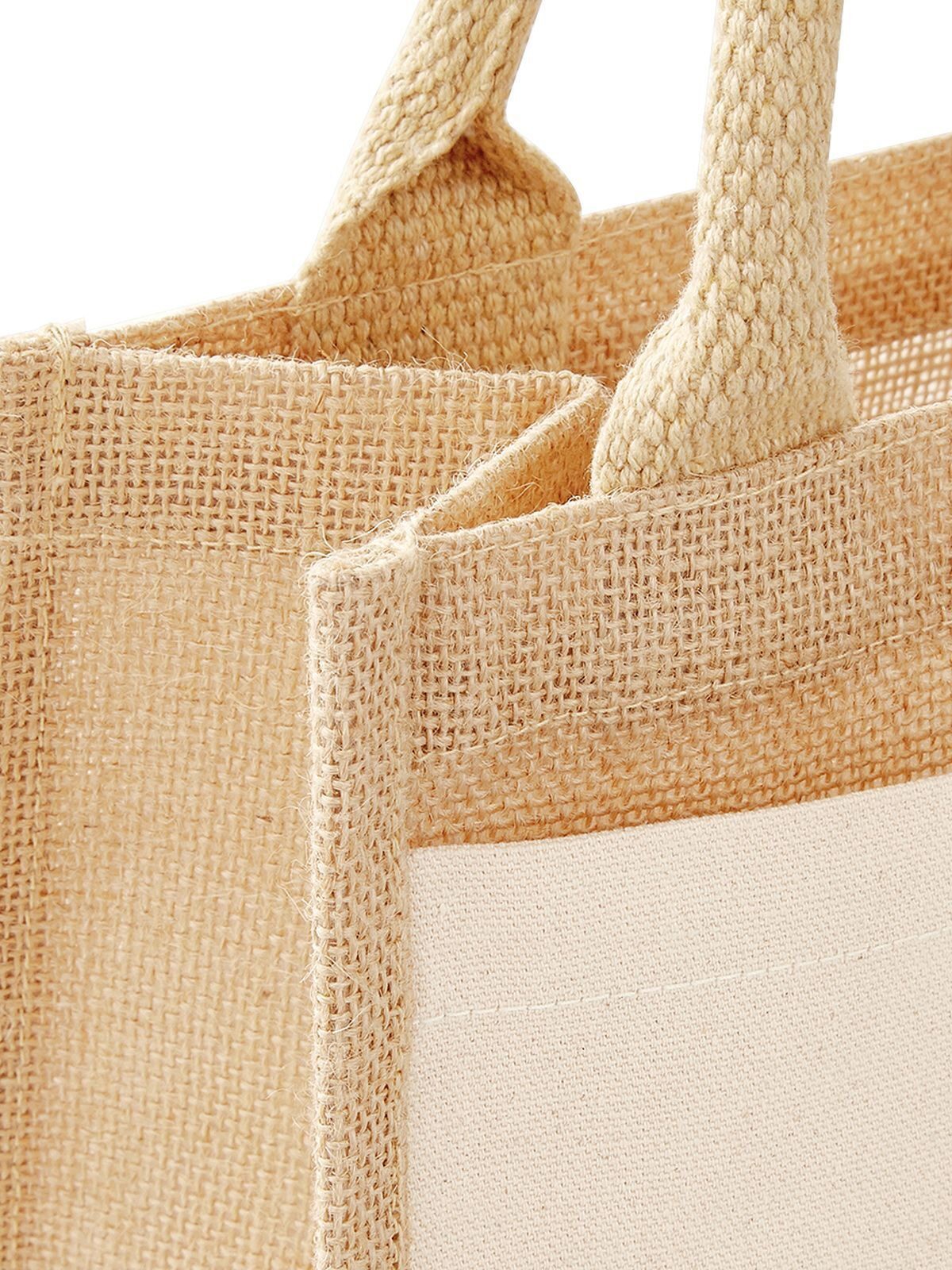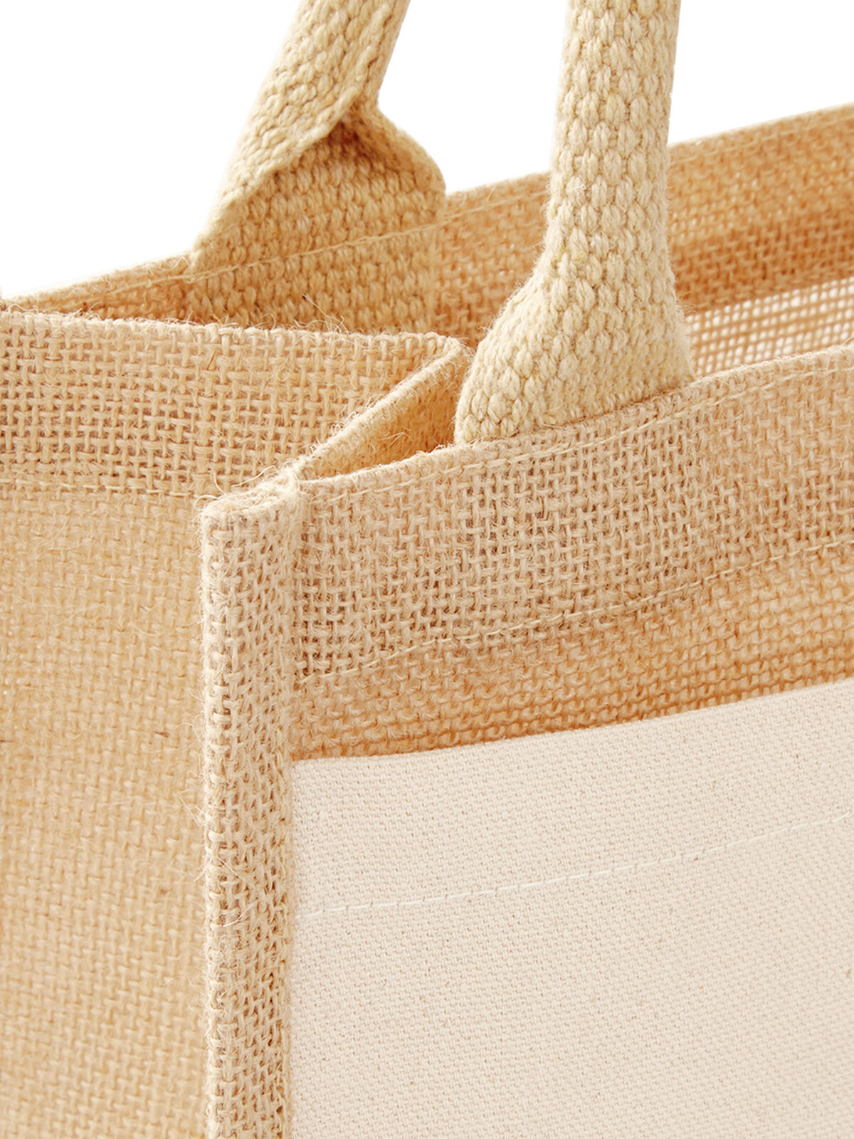 100% laminated jute. Bag with 100% cotton canvas front pocket, print-friendly front pocket, cotton carry handles: 35 cm. Maximum Embroidery: 12 tubular hoop. Maximum Print Area: 21x13cm. Size: 26x22x14 cm.