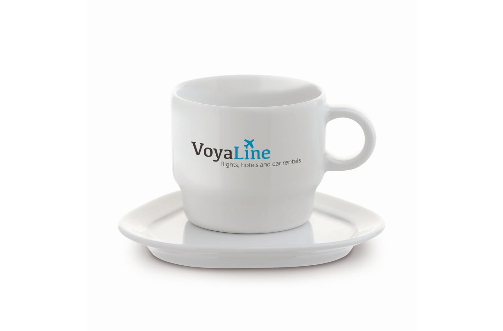 Cup and saucer of high-quality porcelain from the Toppoint design 'Satellite' series. Big imprint space. The triangle shaped saucer has additional space around the cup. Made in Europe.