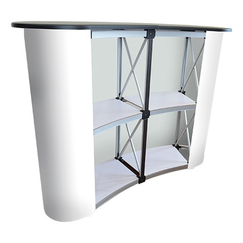 Make your brand stand out at trade shows, exhibitions, or any promotional event with the elegant and practical CURVED PROMOTION COUNTER "CURVY". Designed for professional impact, this portable display counter combines modern aesthetics with exceptional functionality. Its sophisticated curved structure provides a welcoming and eye-catching focal point that draws visitor attention and enhances your brand visibility.