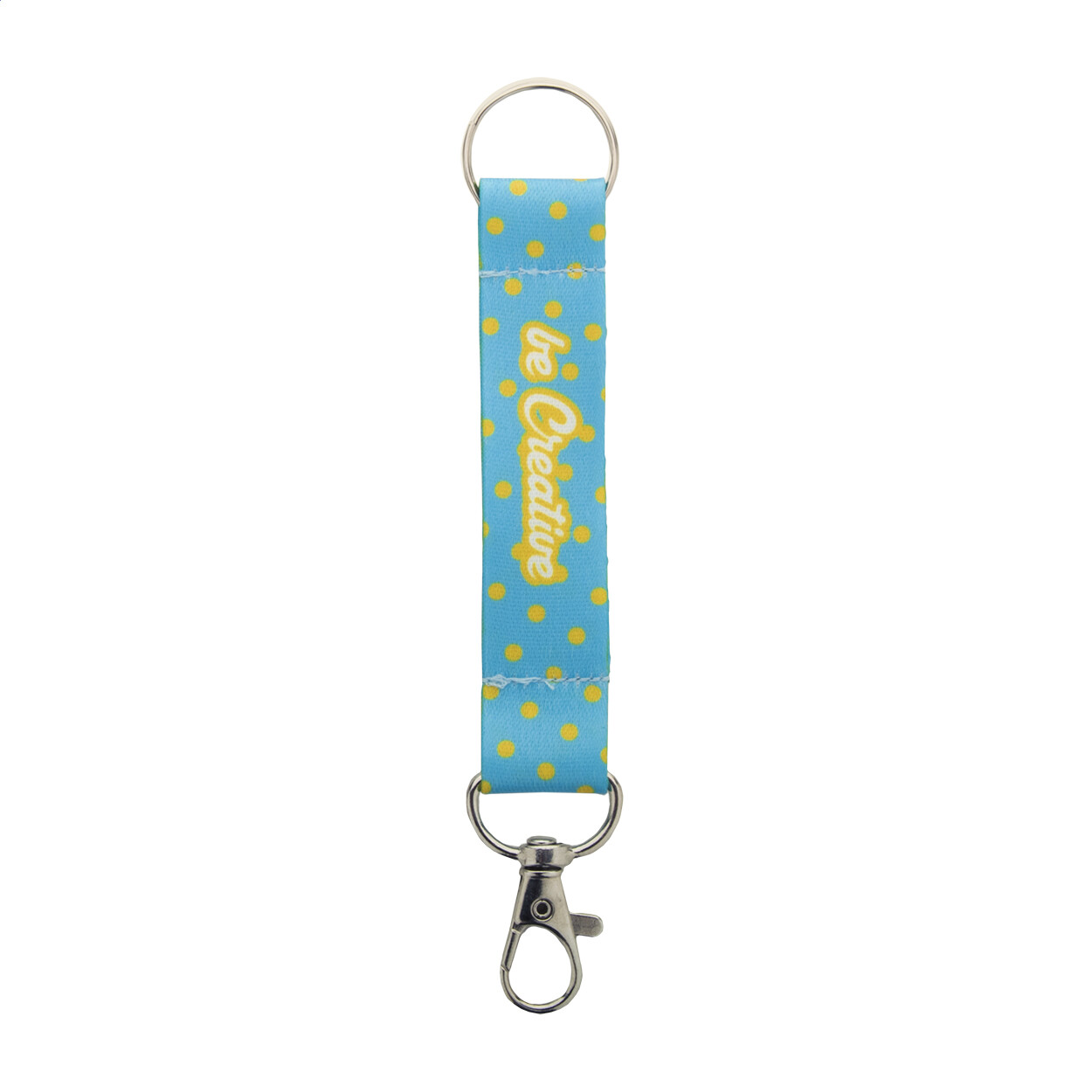 Custom made, RPET polyester mini keyring with sublimation printed graphics on both sides. With metal carabiner and ring. MOQ: 100 pcs.