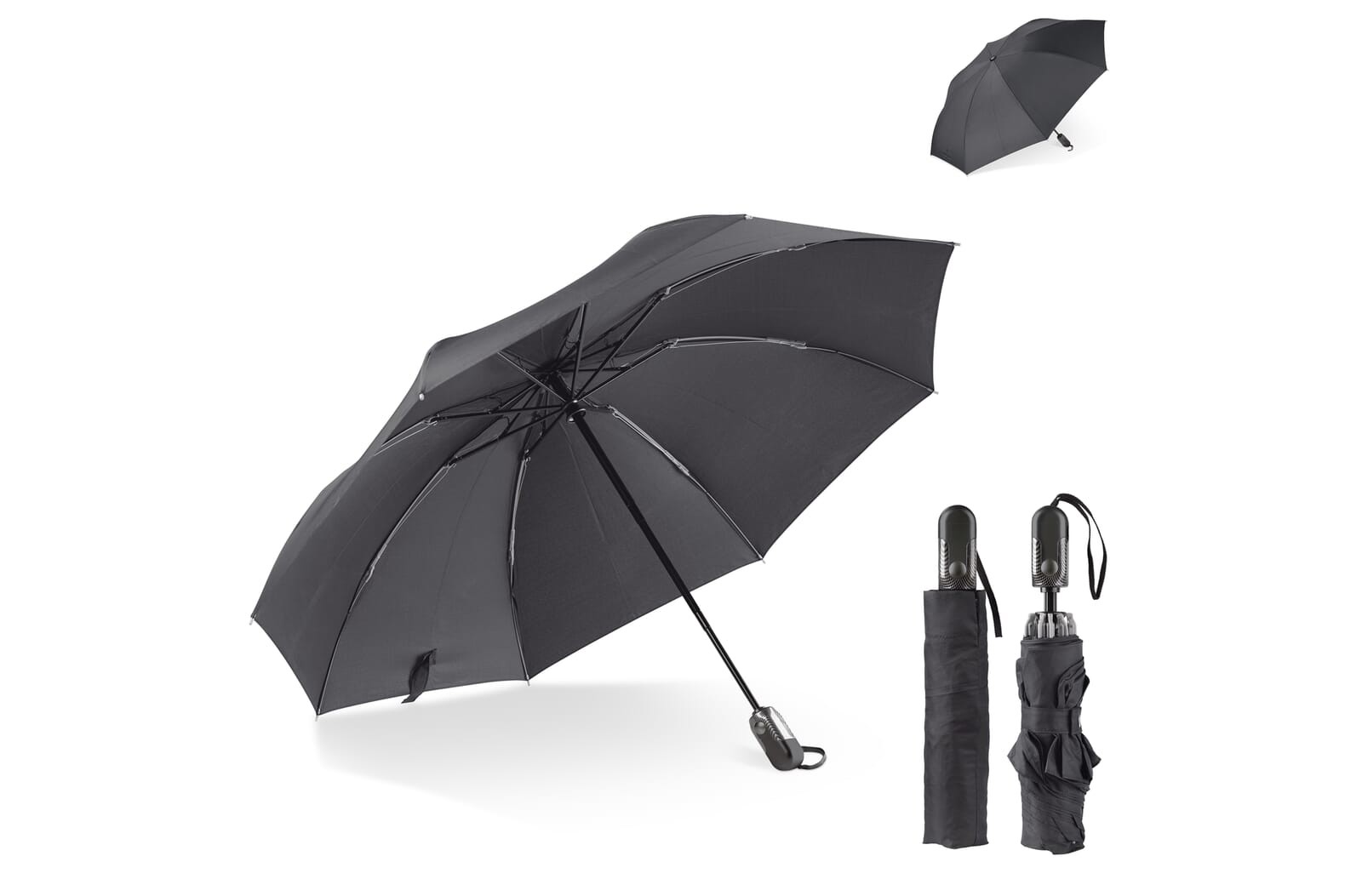 27 inch auto open umbrella in 190T pongee with black plated metal shaft and ribs. Black plastic tips. Straight black EVA handle. Manual closure.