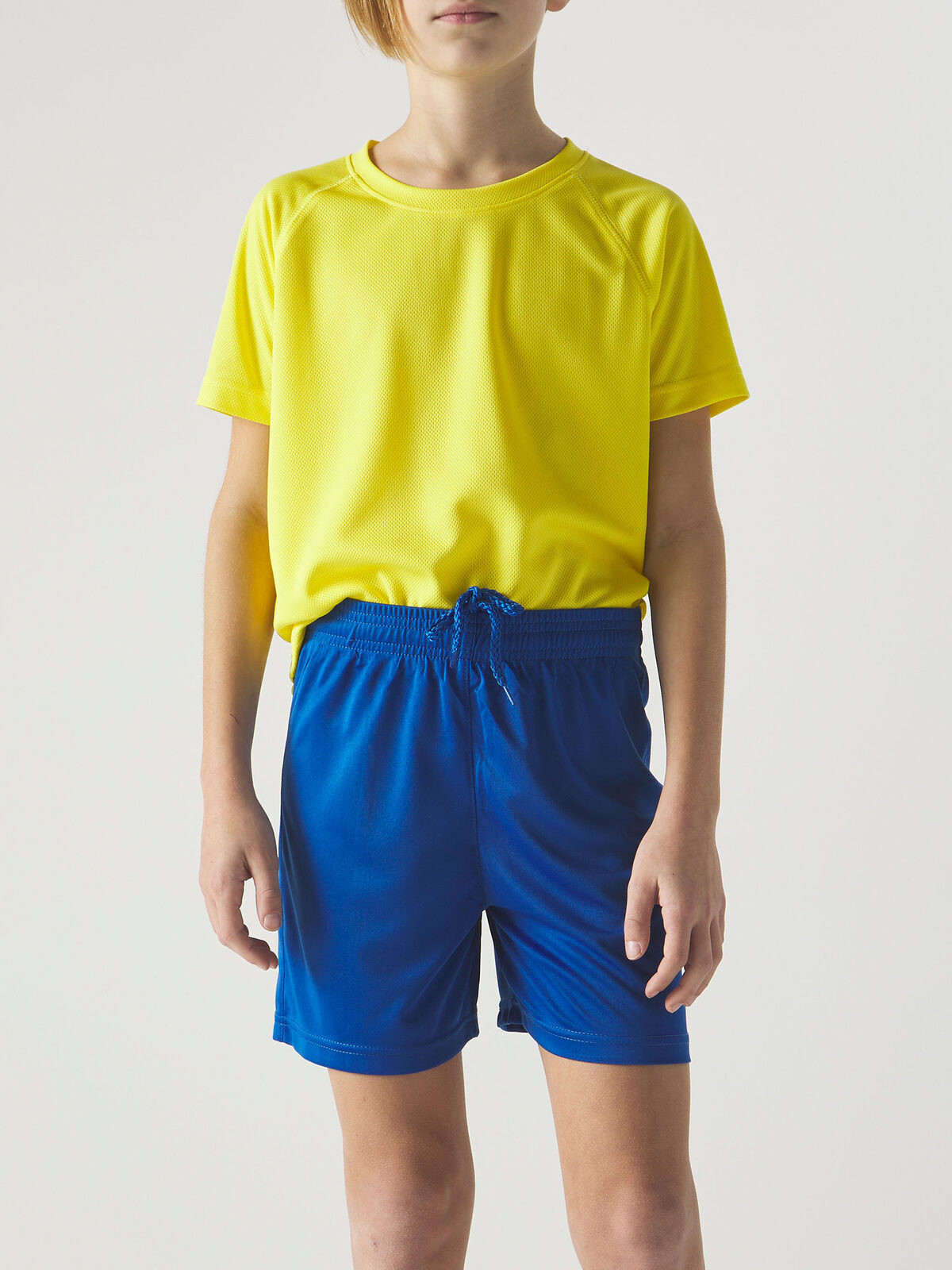 100% polyester. Children's shorts with an elastic waistband and tone-on-tone drawstring. Made without an inner brief and finished with reinforced stitching for added durability. Tear-off label.