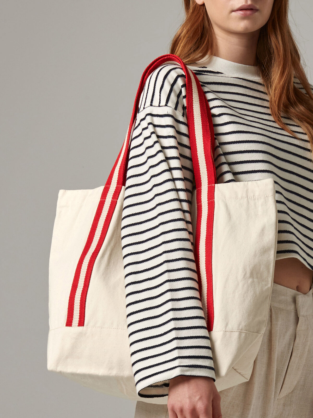 100% organic cotton canvas. 340gsm (10oz/yd²). Bag in premium heavyweight fabric, soft cotton striped webbing handles. Can be carried by hand or over the shoulder. OCS certified organic cotton, certified by Control Union CU811033. Dimensions 36x36x16cm. Capacity: 19 litres. Print area: 17x21cm.