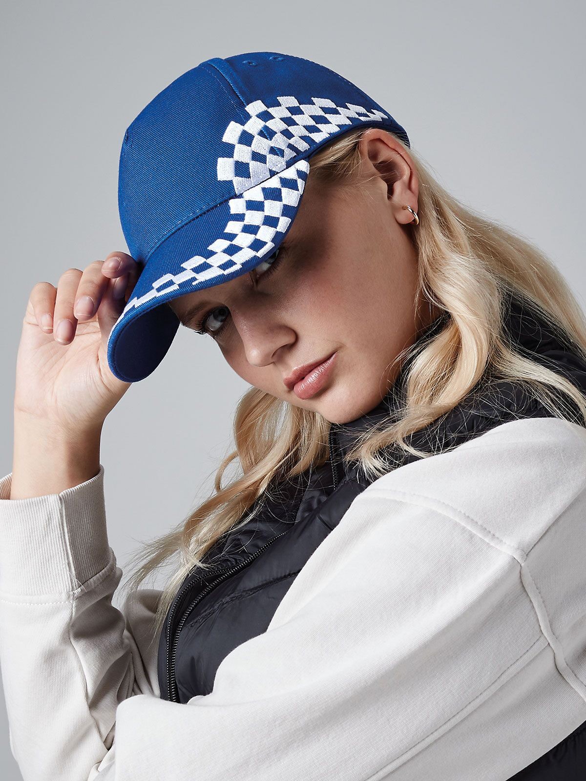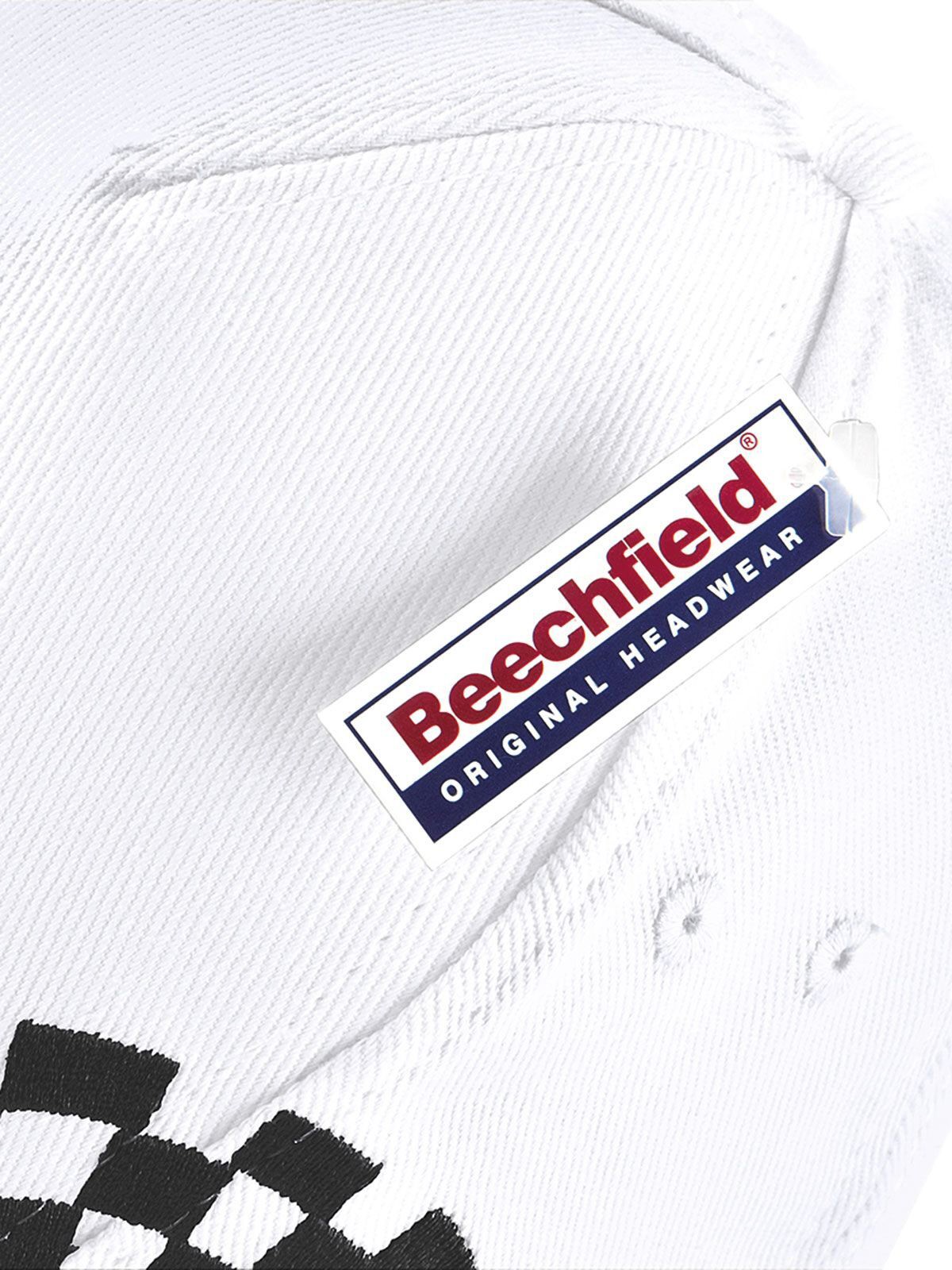 100% Cotton Drill. 5 panel design cap, pre-curved peak, stitched ventilation eyelets, pre-embroidered chequer design, Rip-Strip™ size adjuster. Removable label.
