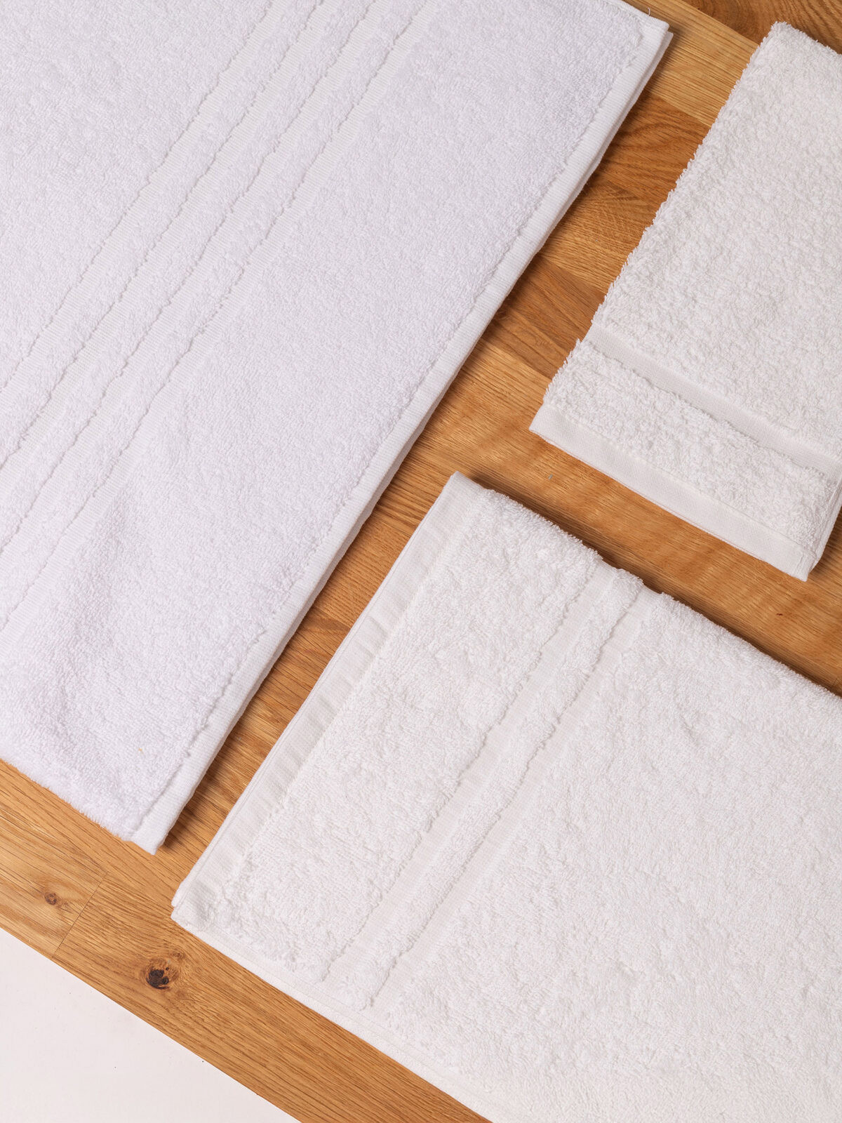 100% cotton. Highly absorbent towel, ideal for professional use in hotels and wellness centers. Customizable with embroidery. 4 towel sizes: 30x50 cm – 1-line border 50x100 cm – 2-line border 70x140 cm – 3-line border 100x150 cm – 4-line border Bath mat: 50x70 cm – 2-line border