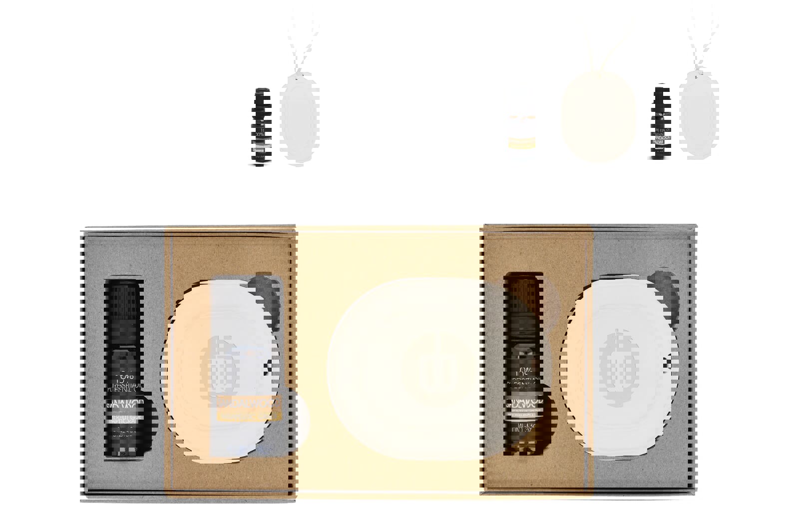 The InSideOut Aroma Gift Set features a porous hanger that subtly diffuses the natural scent of sandalwood with a few drops of pure oil. Ideal for small spaces like the bedroom, bathroom, or wardrobe. A luxurious hanging cord is included in the beautiful gift box, which fits through almost any letterbox.