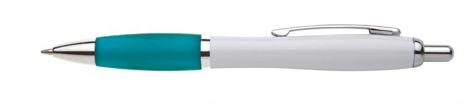 JESI plastic ballpoint pen, with a white body. The rubbered grip has turquoise colour. Decoration with silver ring and chromed button and tip. Large refill, blue ink.