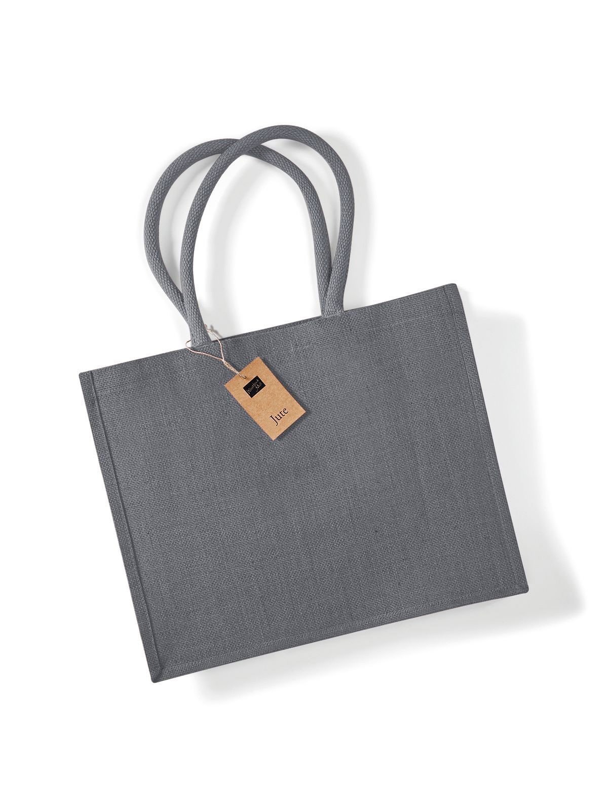 100% laminated jute. Cotton webbing carry handles shopper. handle length: 55 cm, dimensions: 42x33x19 cm. Capacity: 21 Litres, Printing area: 34x24 cm. Removable label.