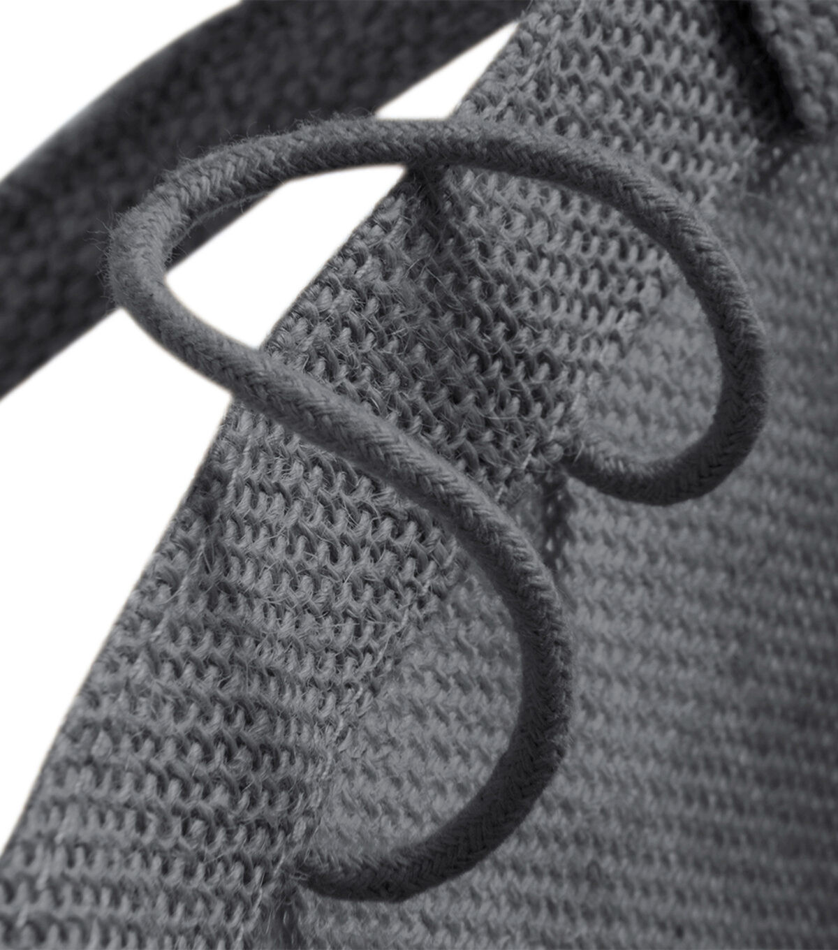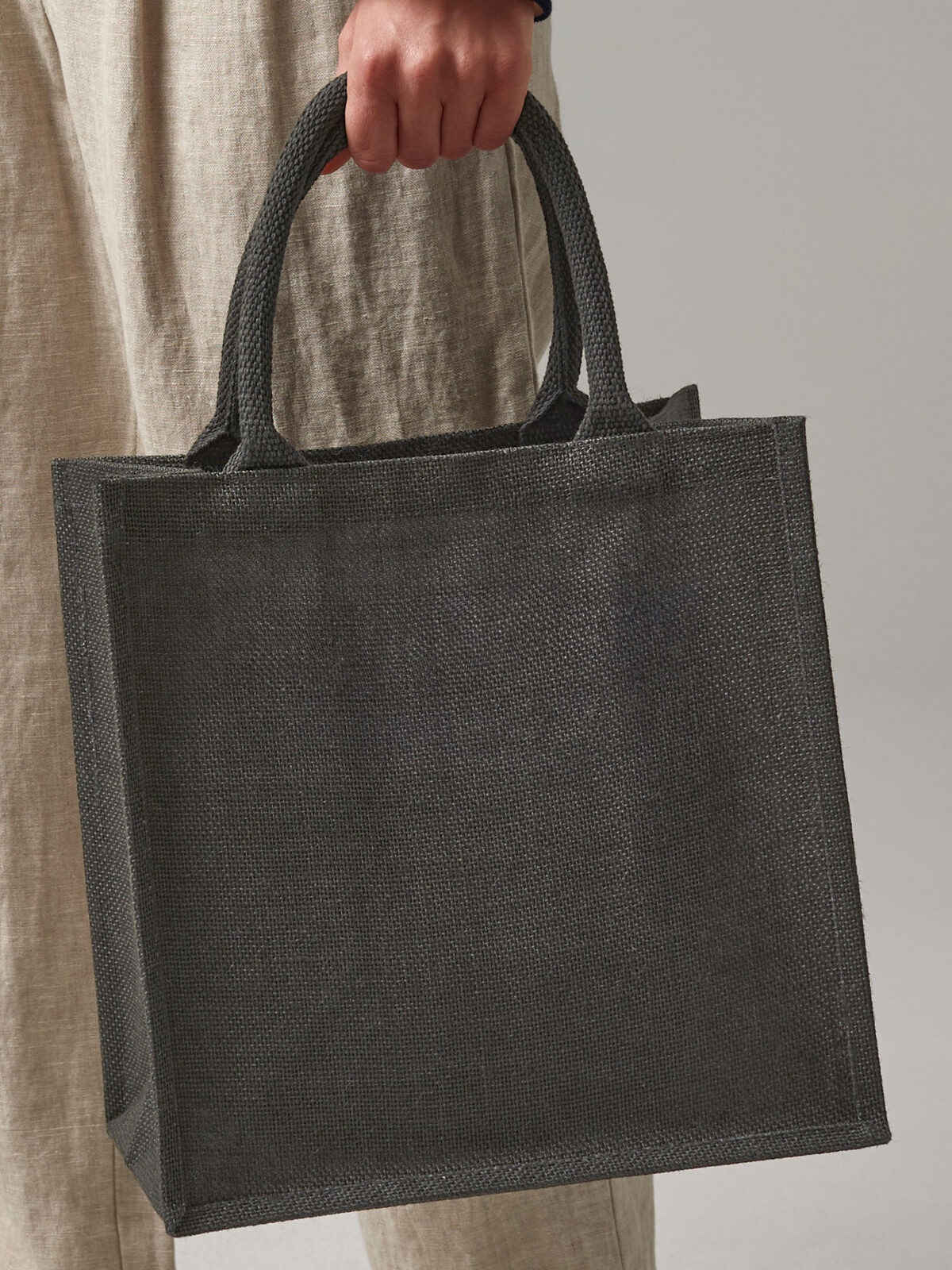 100% jute. Bag with cotton handles. Removable label. Handle length: 40 cm, dimensions: 30x30x19 cm, capacity: 14 liters. Printable area: 23x22 cm.