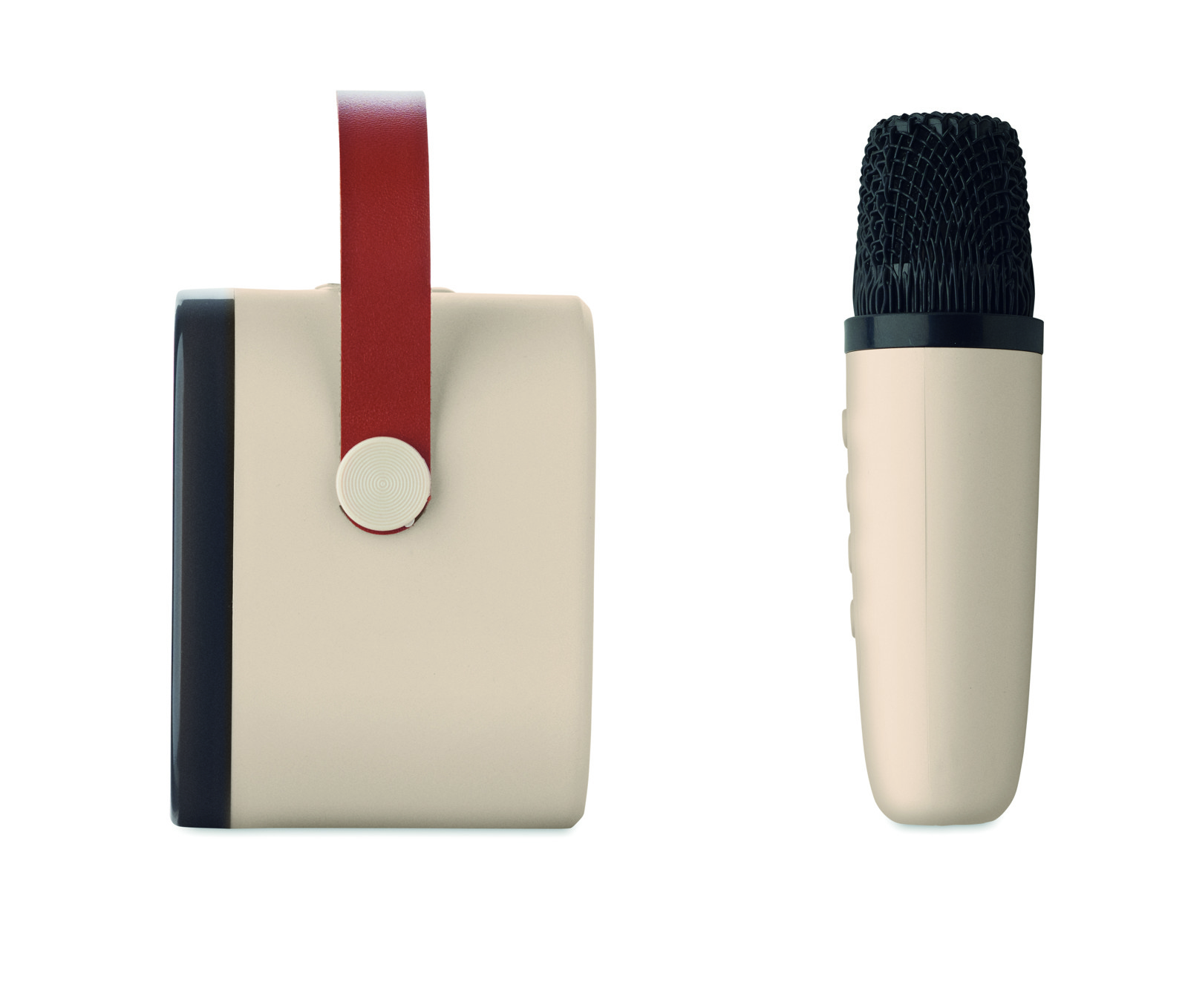 Karaoke set including 5W wireless speaker with LED changing colours light in recycled ABS with PU handle and microphone. Built-In 800 mAh battery speaker and 400 mAh battery microphone. Playing time approx. 3h.