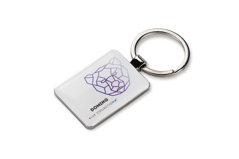 MOTI is a rectangular keychain made of high-quality metal, designed for doming marking service. This technology allows for the precise application of a company’s logo in the form of an aesthetic resin sticker, which creates a 3D-like effect.