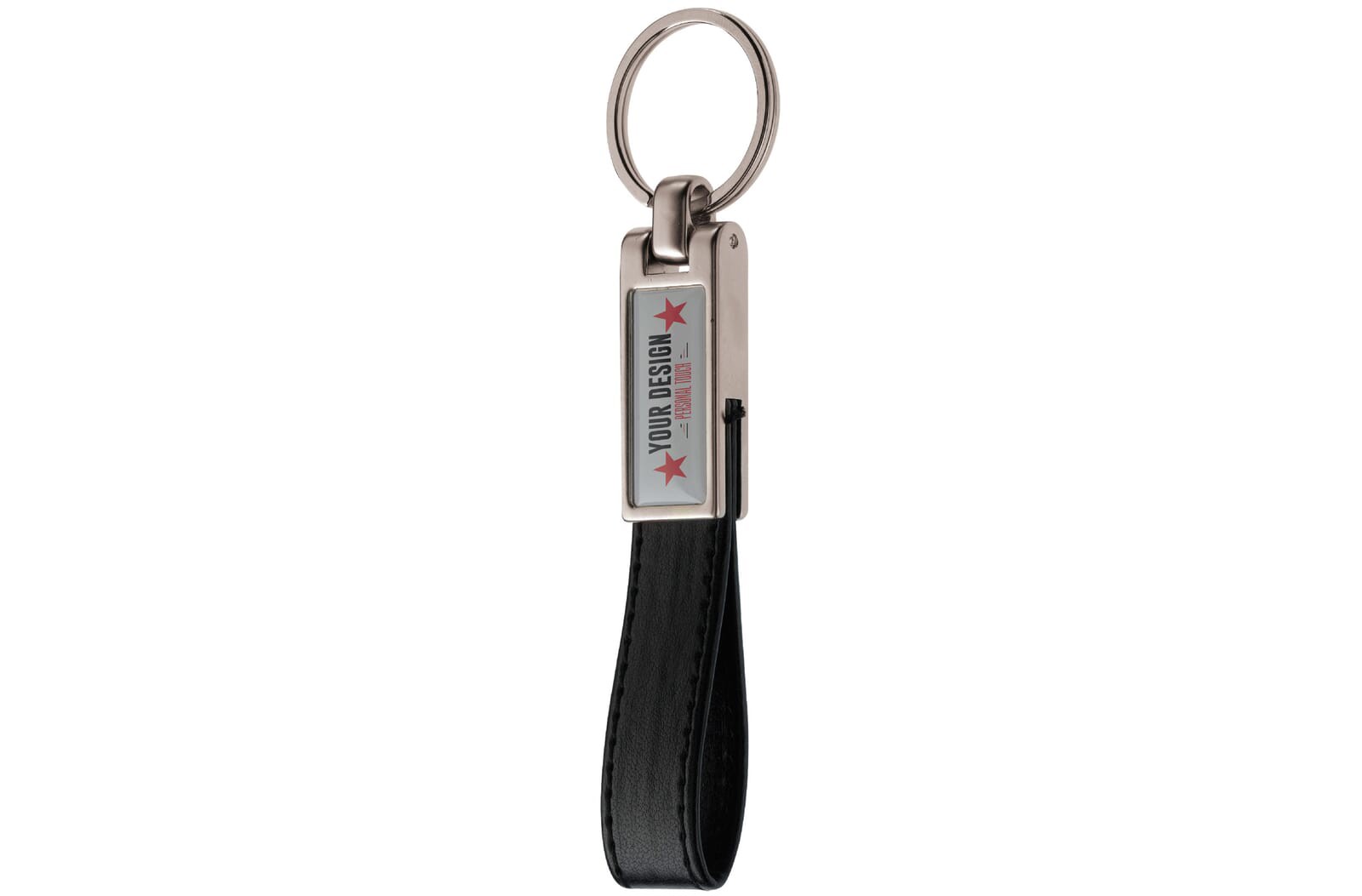 Keyring with a leather strap and rectangular doming.