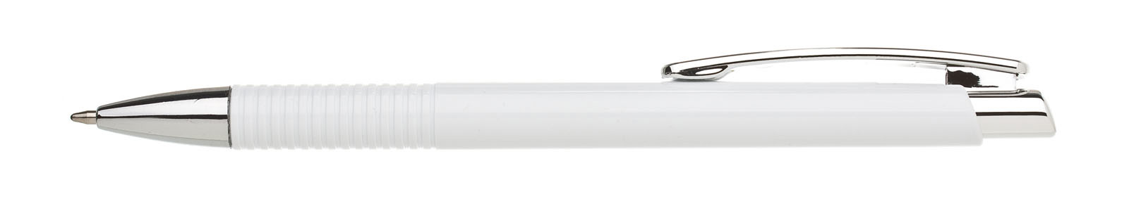 Plastic ballpoint pen LASTI has a white metallic body with a grooved grip and a chrome tip, clip and push-button. Refill X 20- 10.7 cm, blue writing.