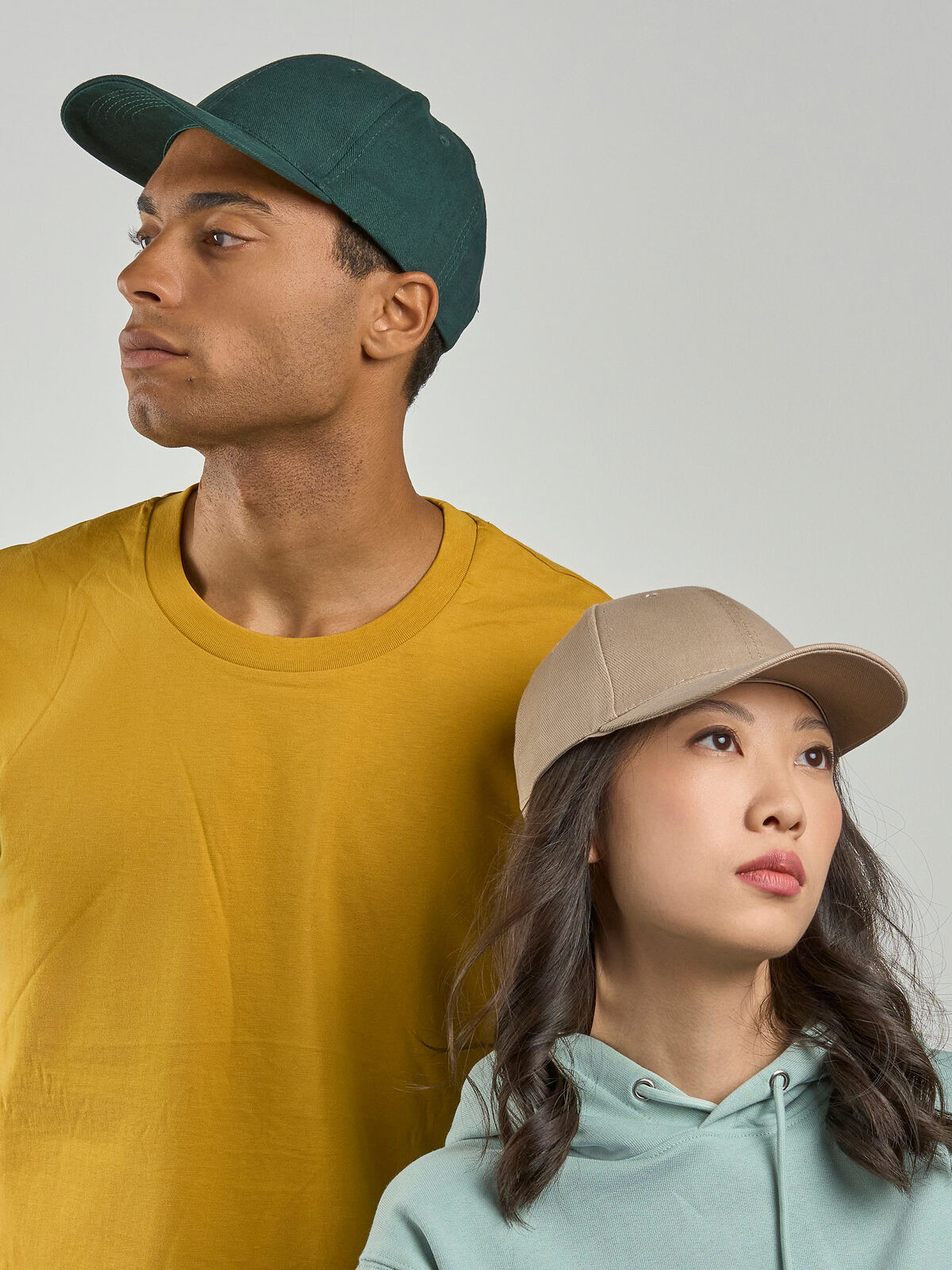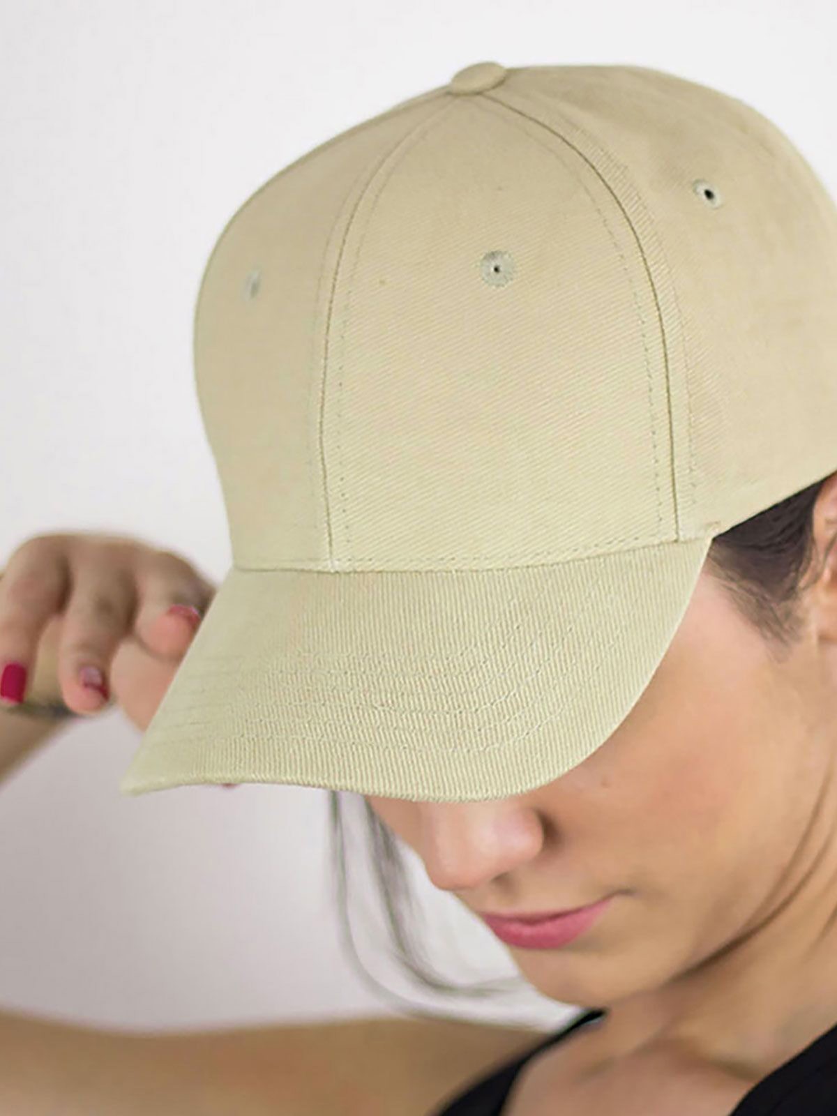 100% heavy brushed cotton. 6 pannels, closure with buckle and metal hole, polyester sweatband, stitched eyelets, structured front panel, precurved visor, 6 stitchings on visor.