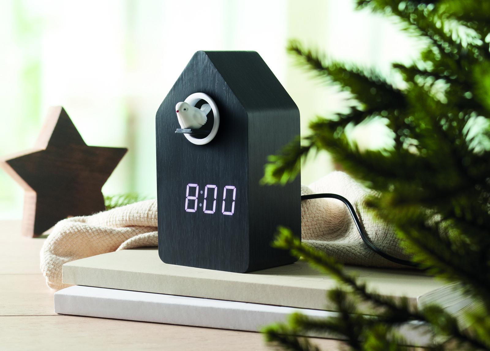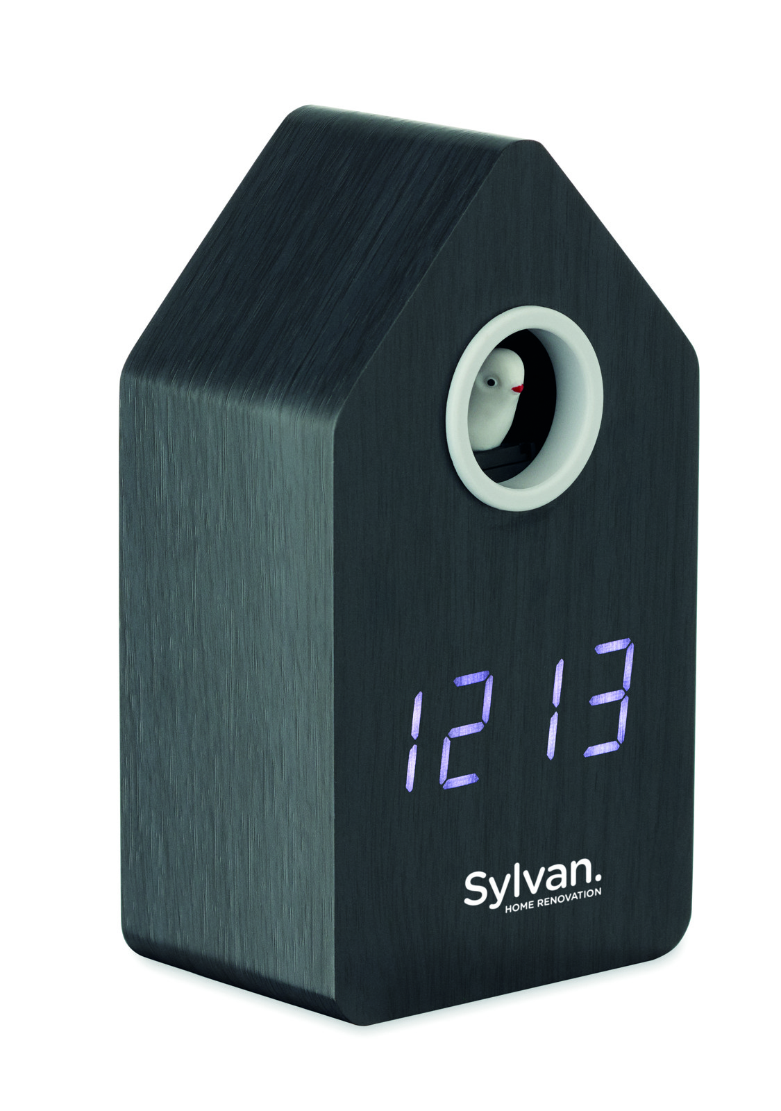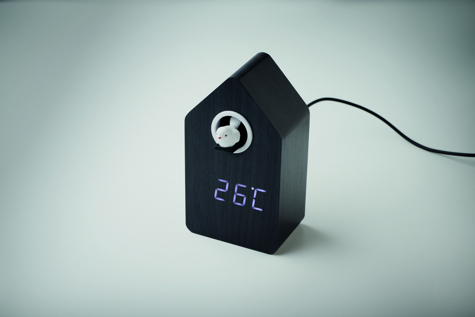 MDF cuckoo clock including a built-in alarm / temperature display. Bird will come out every full hour and during alarm and it has bird cuckoo voice. White LED display. Sound is automatically silenced between 22.00h to 06.00. 5 mins snooze intervals.