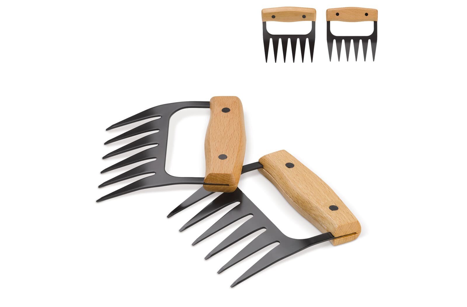 Barbecue bear claws, a great tool set for every person that loves a good barbecue. Great for large pieces of meat on the barbecue. Use these black Teflon coated tools with wooden handles to turn the meat over or pull the meat apart once cooked. Perfect to make that perfect pulled meat dish. Comes packaged in a gift box.