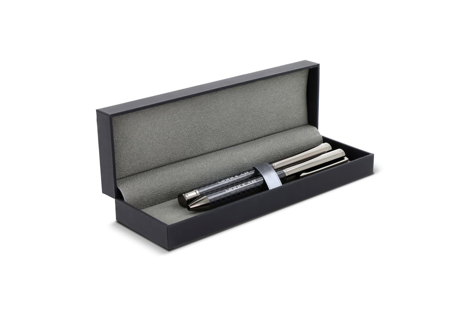 A writing set featuring a metal ballpoint pen and rollerball pen. This set comes presented in a beautiful gift box.