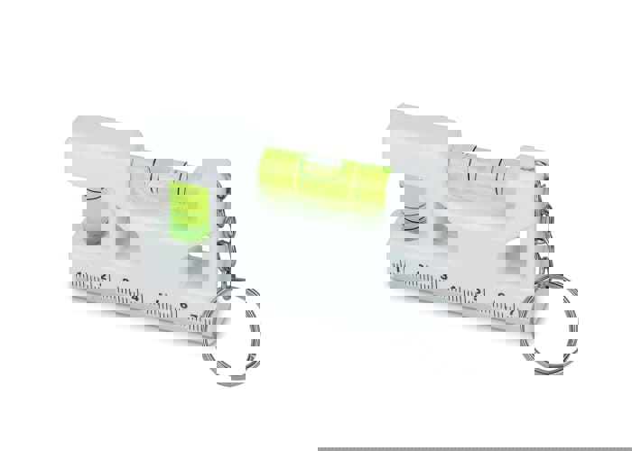Multifunctional key holder with integrated vertical and horizontal spirit levels, a 7cm ruler, and a magnet. Ideal for small leveling tasks, quick measurements.