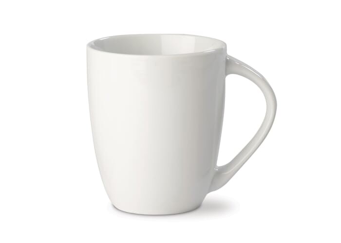 A white mug made from high quality porcelain. Made in Europe. Conical style with a large handle.