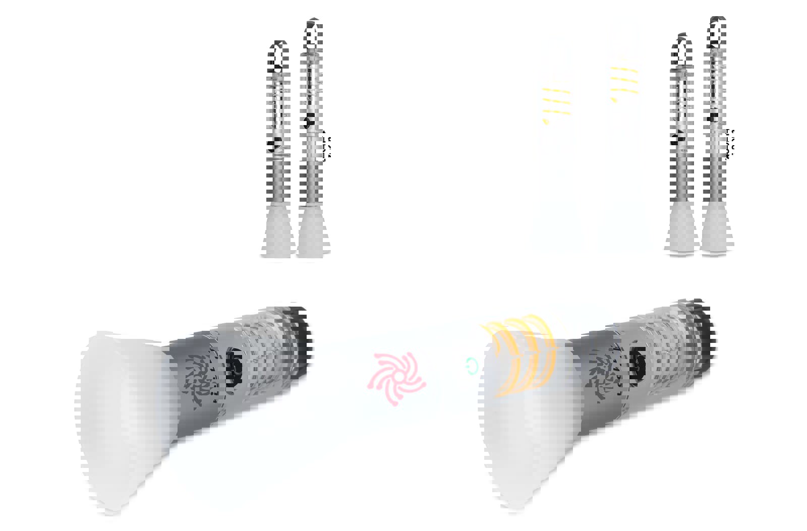 Rechargeable torch made from recycled aluminum, featuring a 1200mAh battery with a 10W LED light and filament light, providing up to 400lm brightness. LED light modes include high, medium, and flash, while the filament light has on and flash modes. Equipped with a built-in clip on the back and a zoom function for versatile use.