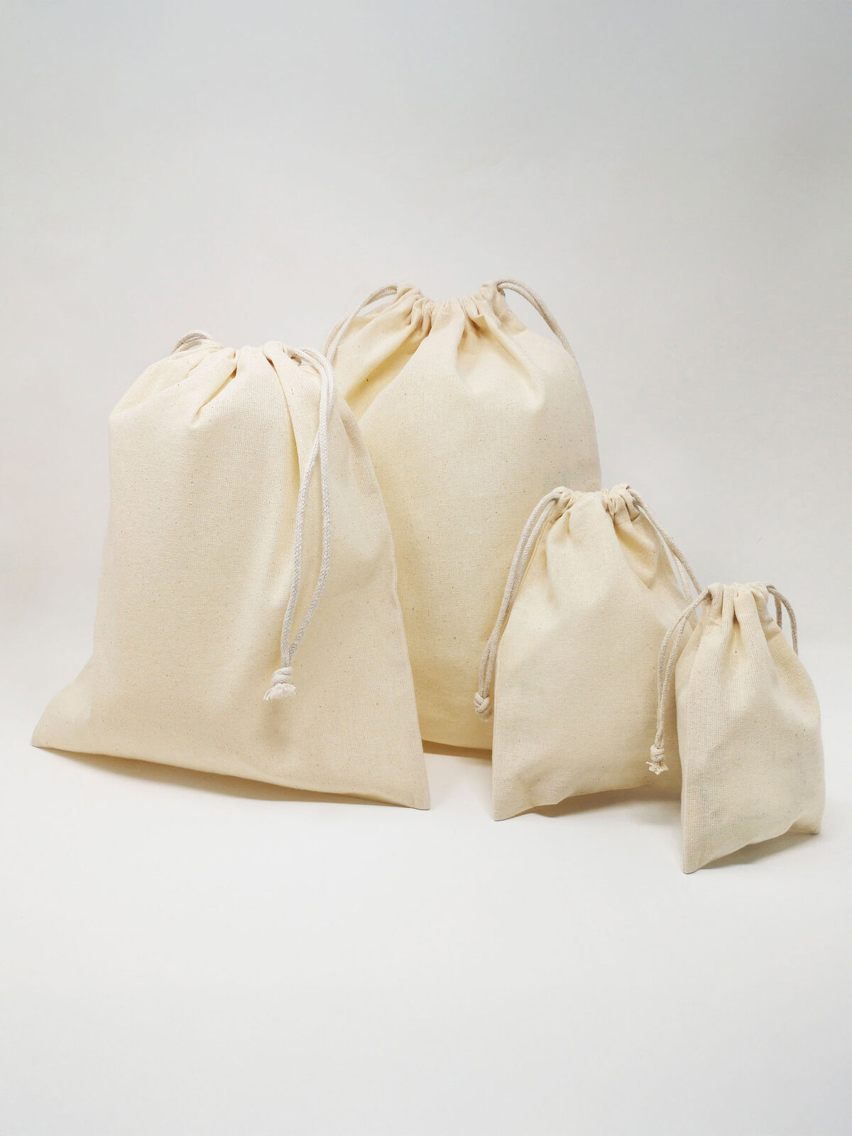 100% organic cotton. Rope double draw cord closure. Cords in natural color. Dimensions: XS: 10x15 c, cap. 0,25 lt. - S: 15x20 cm, cap. 1 lt. - M: 25x30 cm, cap. 3 lt. - L: 30x40 cm, cap. 7 lt.