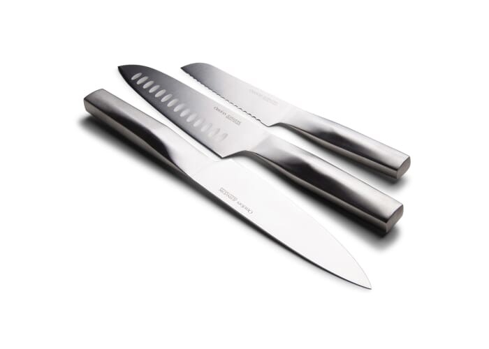 The complete knife set from Orrefors Jernverk. Here we have collected all the knives that are a "must" in the kitchen. You get a chef's knife, a Japanese chef's knife and a tomato knife of the highest quality. Delivered in a nice gift box, and makes an excellent gift. Jon Eliason is behind the modern design.