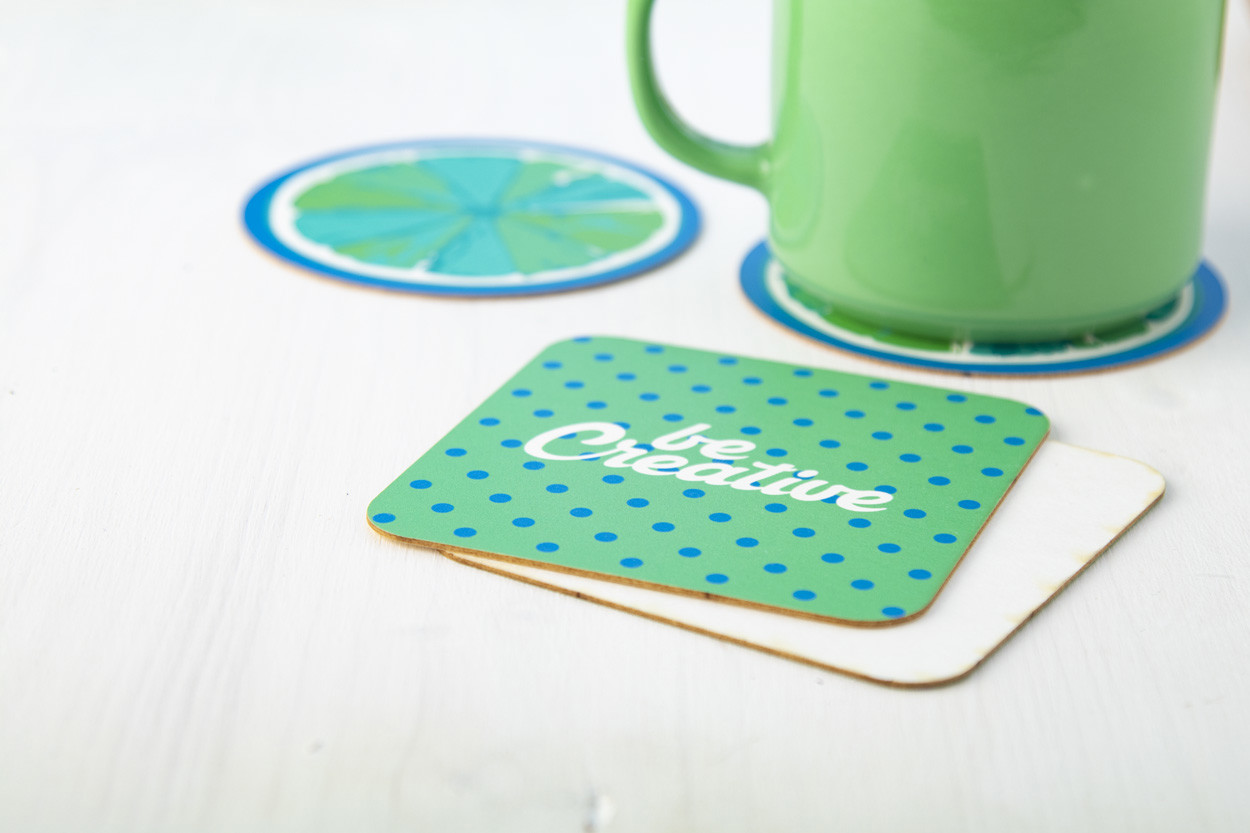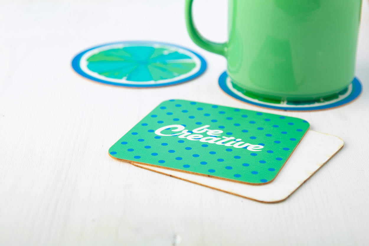 Custom made, absorbent paper coaster with custom graphics on one side. MOQ: 250 pcs.