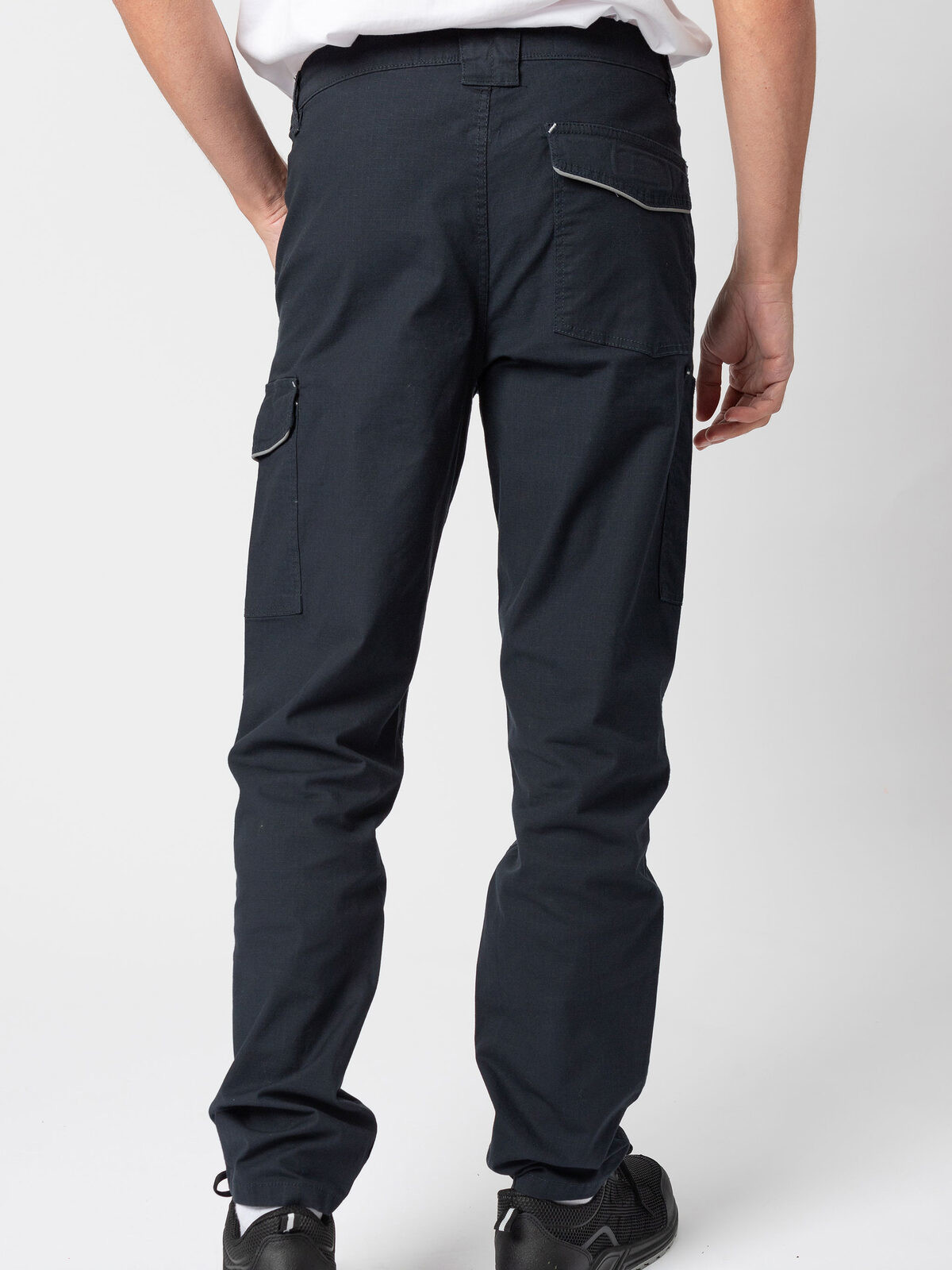 98% cotton, 2% elastane. CE CAT1 certified pants, multi-pocket stretch fabric, pre-washed to minimize shrinkage, two front pockets, one side pocket with piping and Velcro closure, one ruler or tool pocket, one back pocket with reflective piping and Velcro closure. HiViz insert on the side and back. Triple stitching for maximum garment strength, contrasting color reinforcement stitching. Two front seams below the knee, elastic waistband, and oversized belt loops. Tear-Away label.