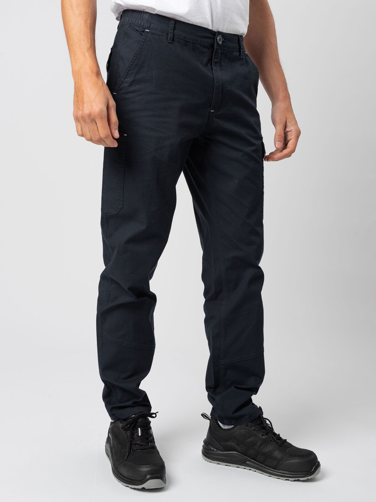 98% cotton, 2% elastane. CE CAT1 certified trousers, stretch multi-pocket trousers, rip-stop fabric, two front pockets, one side pocket with piping and Velcro closure, a meter or tool holder pocket, a back pocket with reflective piping and Velcro closure. HiViz insert on the side and back. Triple stitching for maximum resistance of the garment, reinforced stitching in contrasting color. Two front seams under the knee, elastic waistband and increased loops. Tear-Away label.