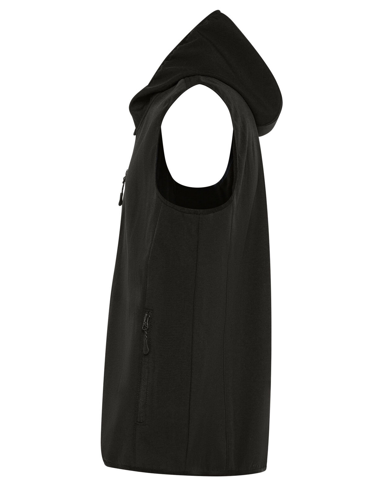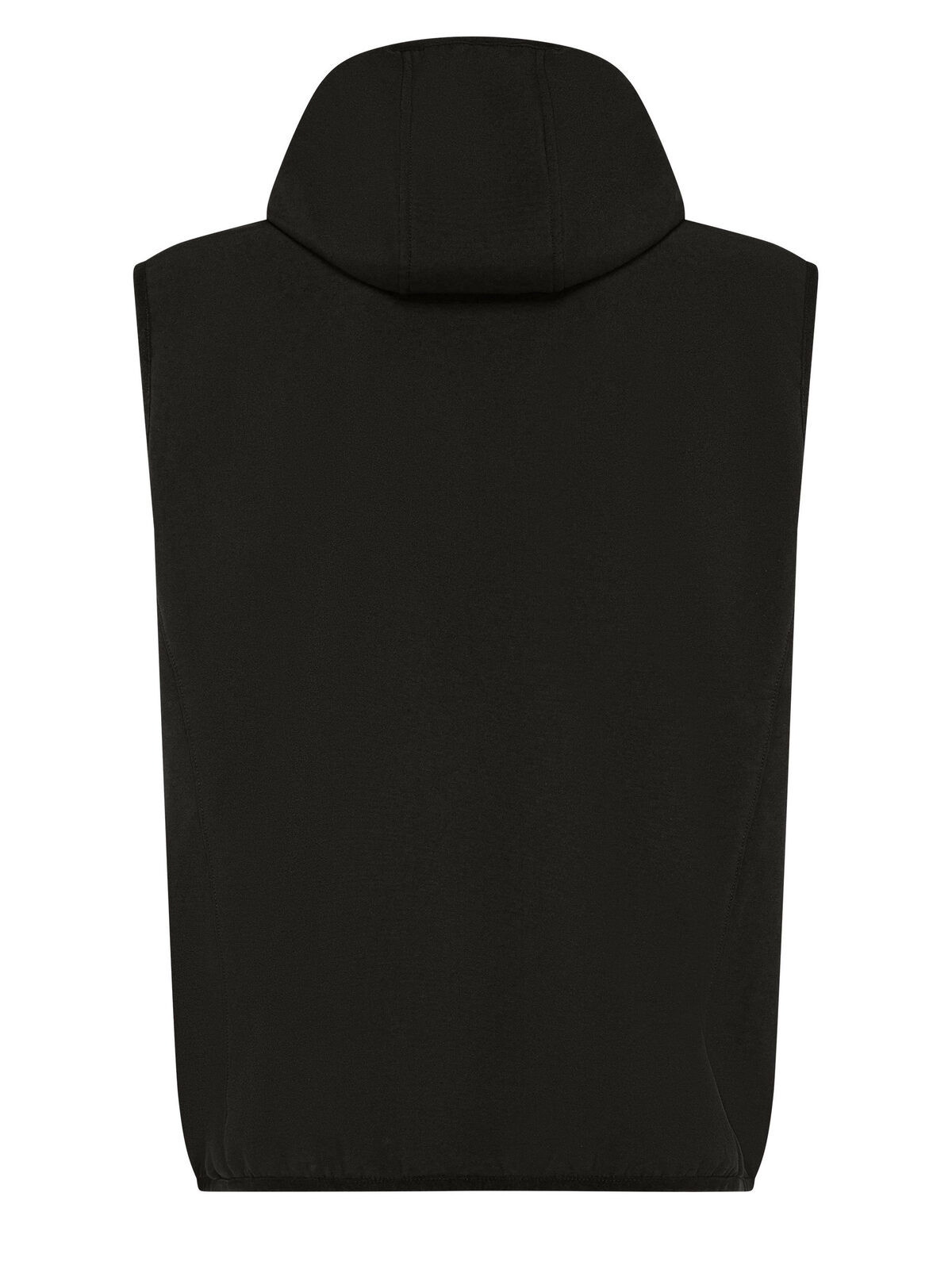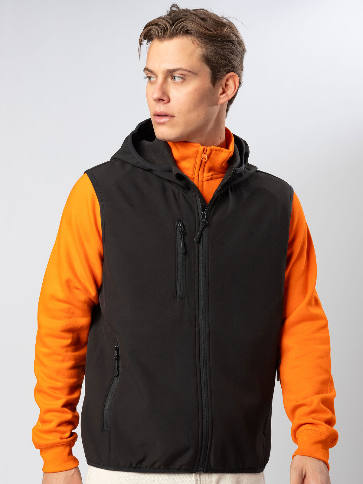 94% recycled polyester, 6% elastane. 3-layer softshell vest with hood, eco-sustainable recycled soft polyester fabric. Windproof (rainproof 5000 w/p). Two comfortable side pockets and tone-on-tone zip chest pocket. Two large internal pockets. Plastic zip puller with reflective fiber. Sleeveless and bottom with elasticated edge. Woven cut label around the neck and label with logo and instructions on the tearable side.