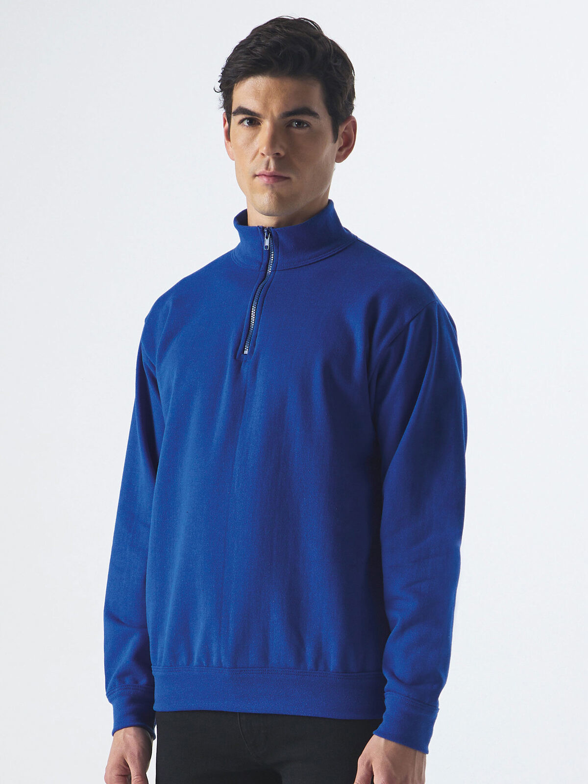 65% recycled cotton, 35% recycled polyester. Half-zip sweatshirt in recycled cotton and polyester fabric, straight sleeve, fleece inside. 3-thread construction: 100% cotton exterior for excellent print quality, dimensional stability, and wash resistance. Entirely Italian production. Plastic zip, metal zip puller. Side seams. Tear-Away label.