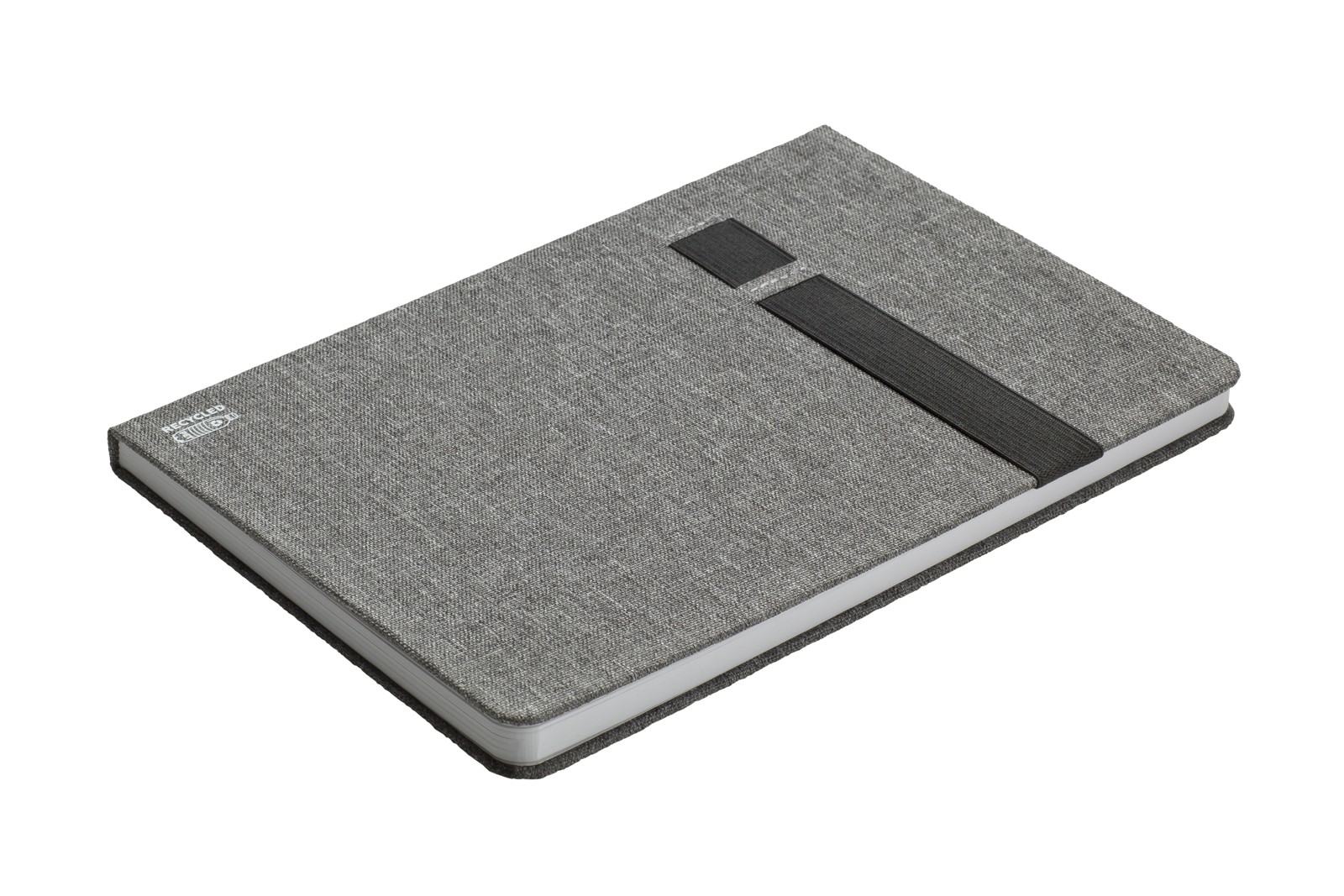 A5 notebook in gray RPET covers has 80 sheets. The notebook features a loop for a pen and also for a mobile phone.