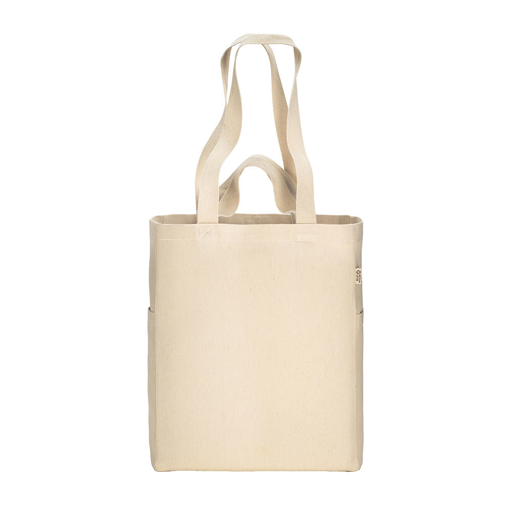Recycled 280 g/m2 canvas cotton tote bag with double handles and gusset, with two side pockets and one internal pocket