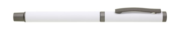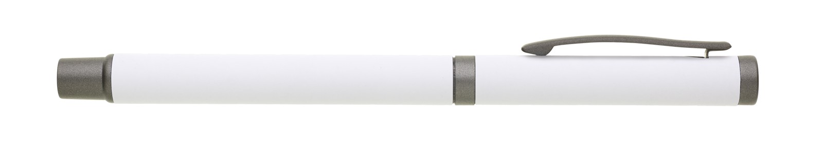 Elegant metal roller RIFLO SOFT in white with dark gray accents and a rubberized surface. Features a ceramic refill that writes in blue.
