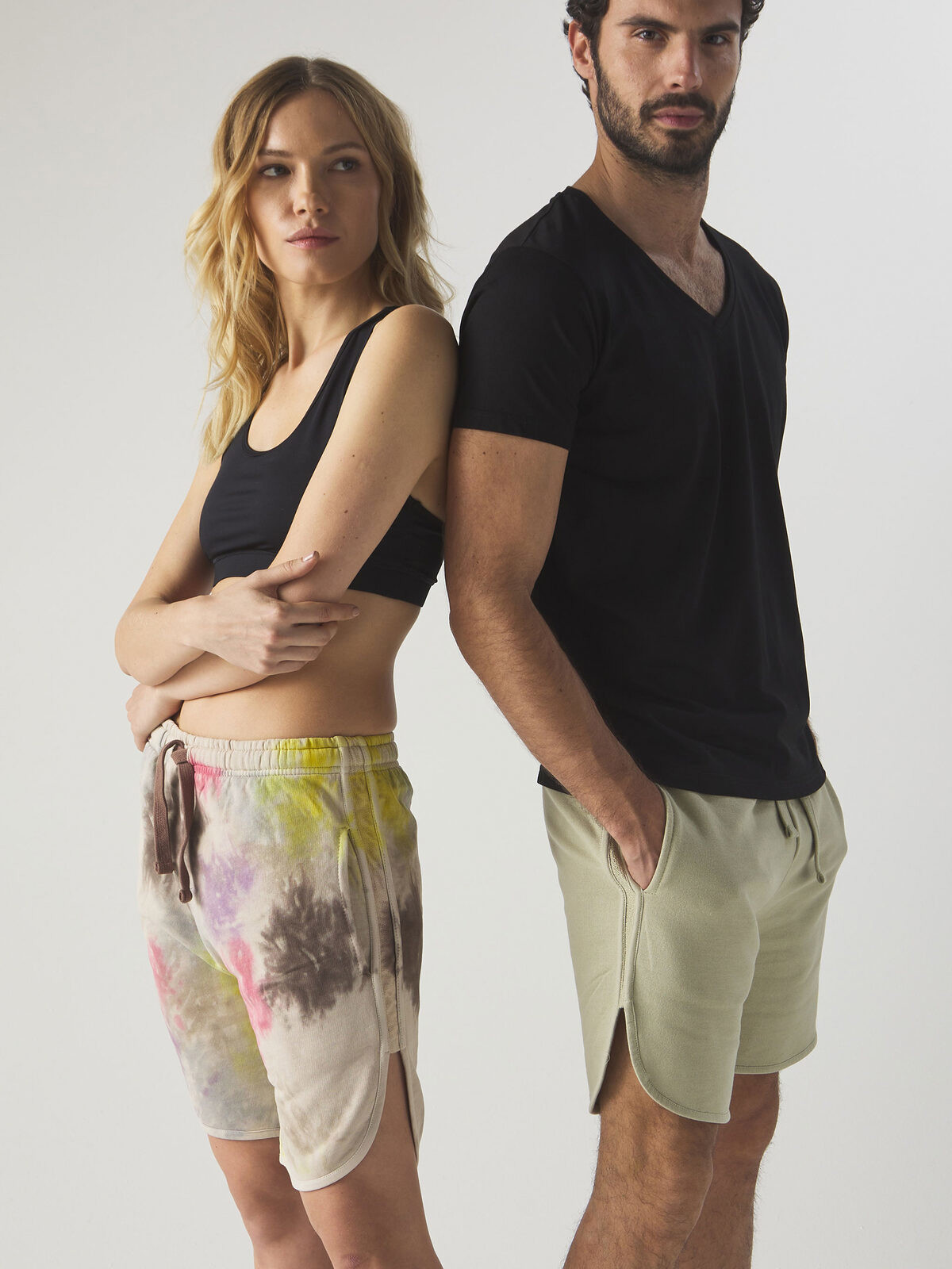 100% cotton. Genderless shorts in French Terry fleece, elastic waistband with tone-on-tone flat cord, side pockets. Side bands in reverse terry, hem with tone-on-tone border. OW color suitable for garment dye and batik dyes, 100% cotton stitching, fabric washed before cutting to avoid shrinkage. Composition Gray Heather: 93% cotton 7% polyestere.
