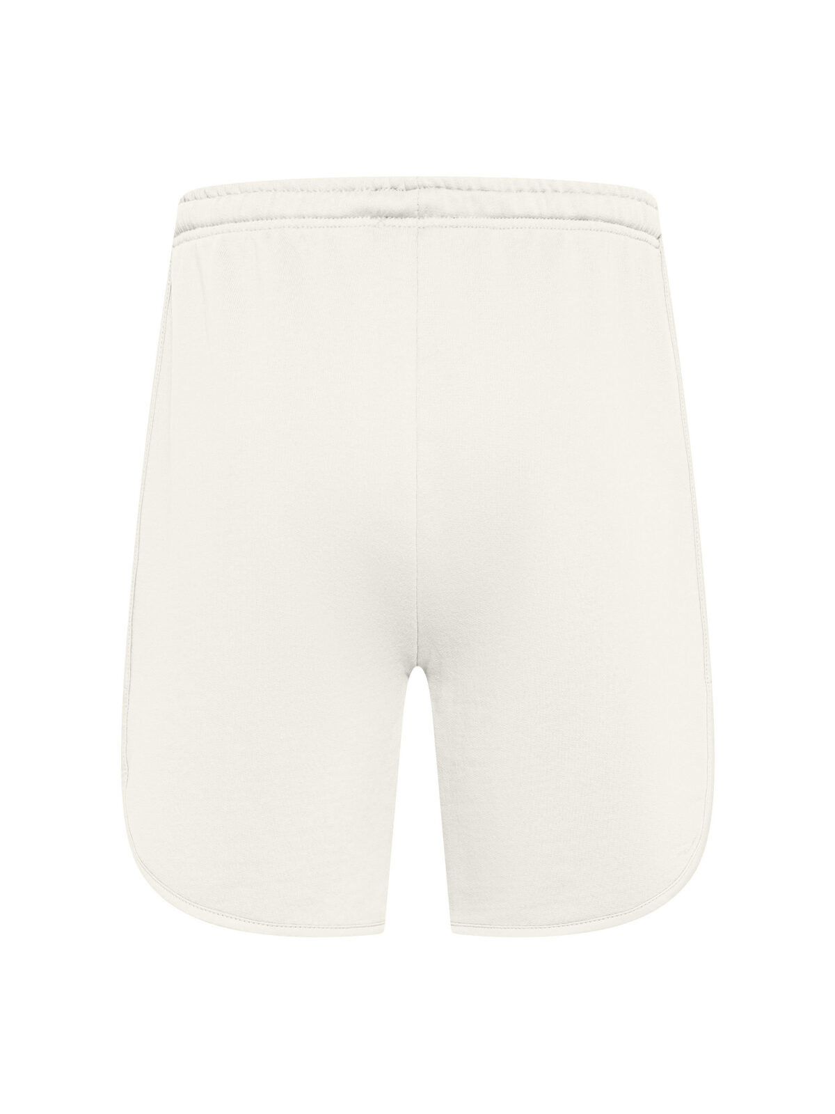 80% cotton, 20% polyester. French Terry jogger shorts, pocket lining in single jersey, back patch pocket, 1x1 rib waistband, dyed to match round drawcord with metal tipped ends, metal eyelets, double needle topstitching. Tear-Away Label.