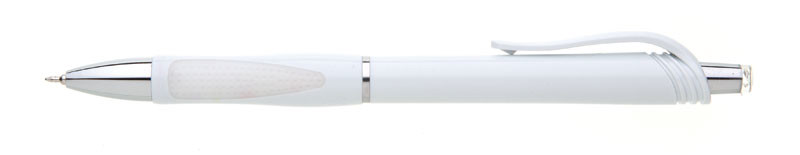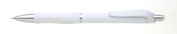 White plastic ballpoint pen SALA SG with chrome accessories such as tip, push-button, stripe in the middle of the body. The grip is rubbered, coloured matching to the pen, like the clip and the tip of the button. Refill X 20 semigel with a microtip (0,5 mm), blue coloured.