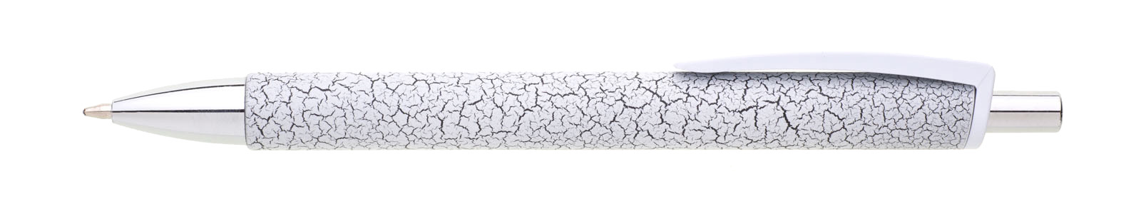 Plastic ballpoint pen SINAY with cracked surface effect. Tip and click are chrome-plated, clip is made of white plastic, black body. Large refill, blue writing.