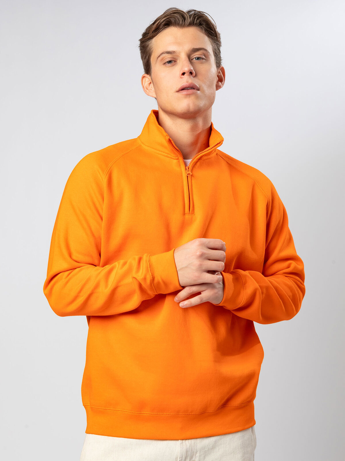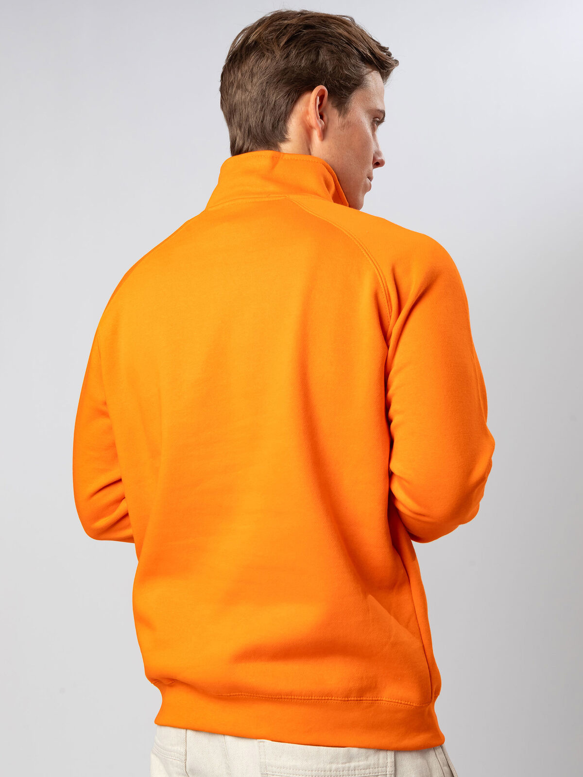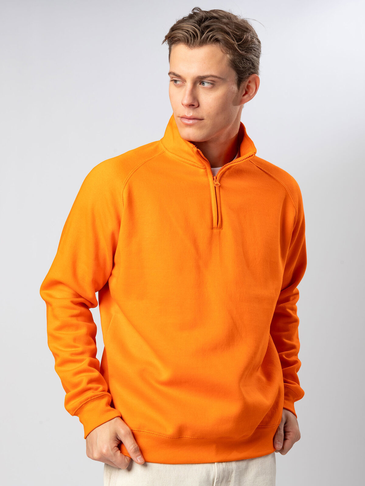 70% cotton, 30% polyester. Half zip sweatshirt with raglan sleeves, structure with side stitching. The tearable label makes it ideal for customization. Fleece interior. 3-thread construction: 100% cotton exterior for excellent print quality, dimensional stability, and wash resistance.