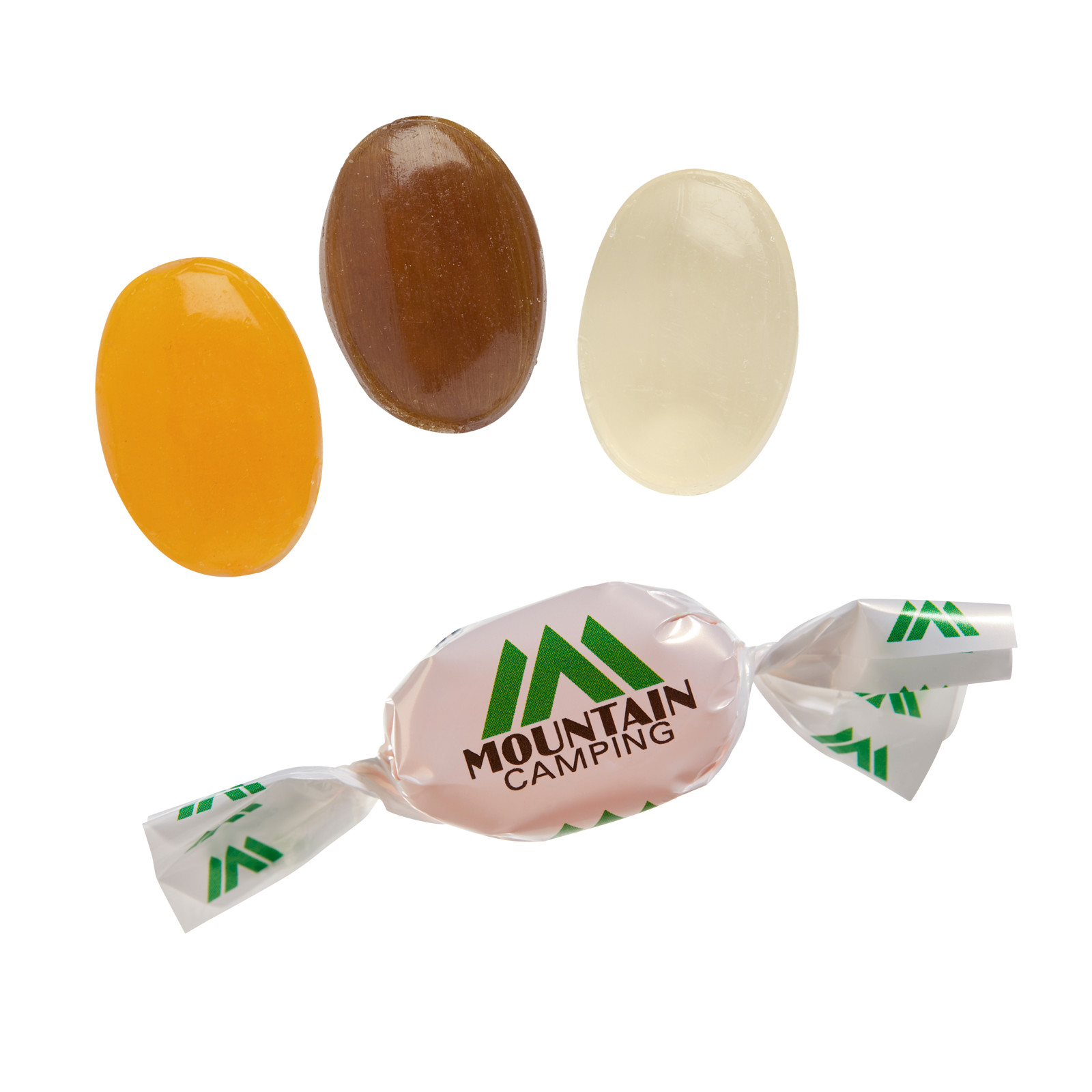 Candies, individually wrapped into a compostable transparent or white foil wrapper. Further flavours from 500 kg possible on request.